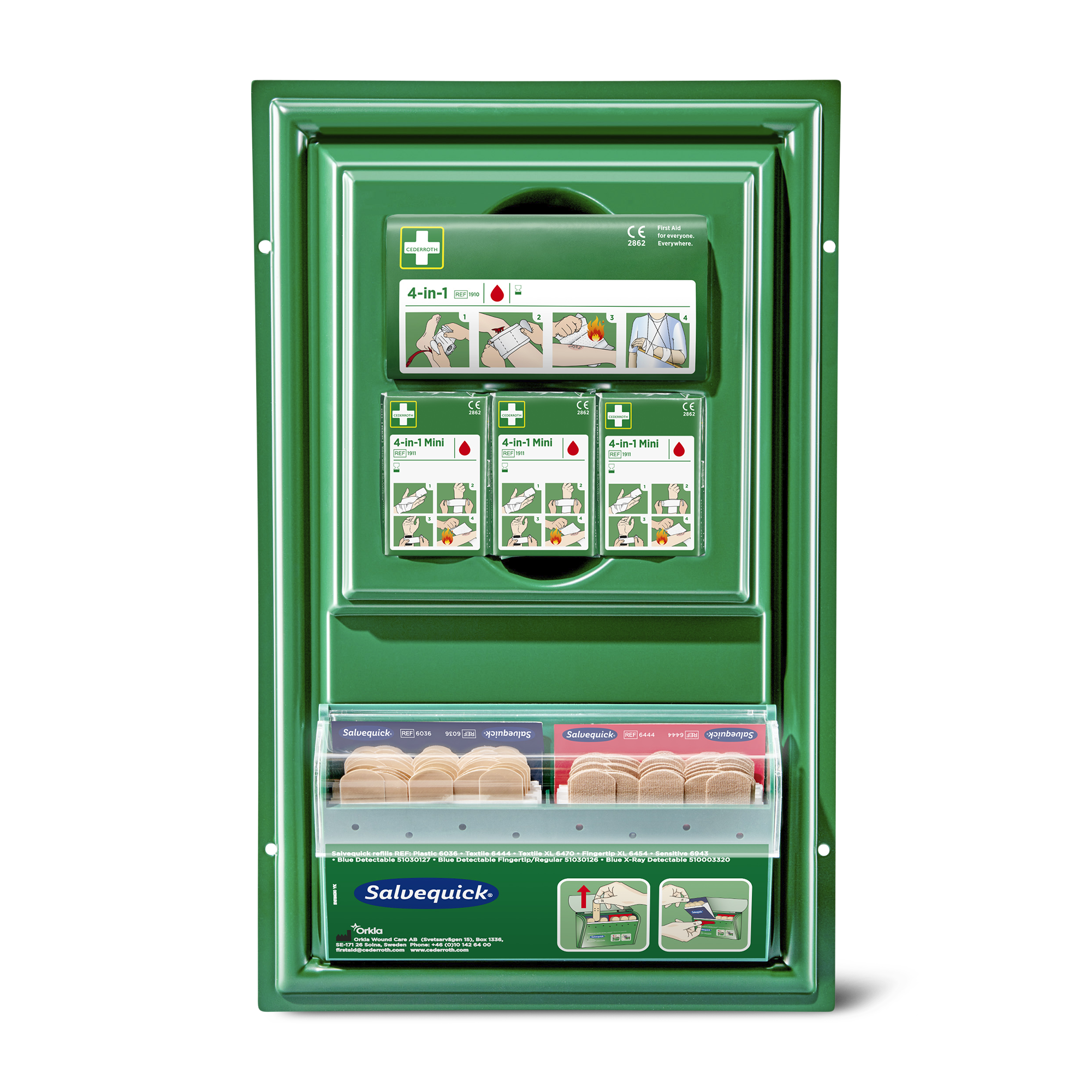 1 x Salvequick plaastriautomaat koos tekstiilplaastritega, 40 tk (tellimiskood 6444) ja plastikplaastritega, 45 tk (tellimiskood 6036),