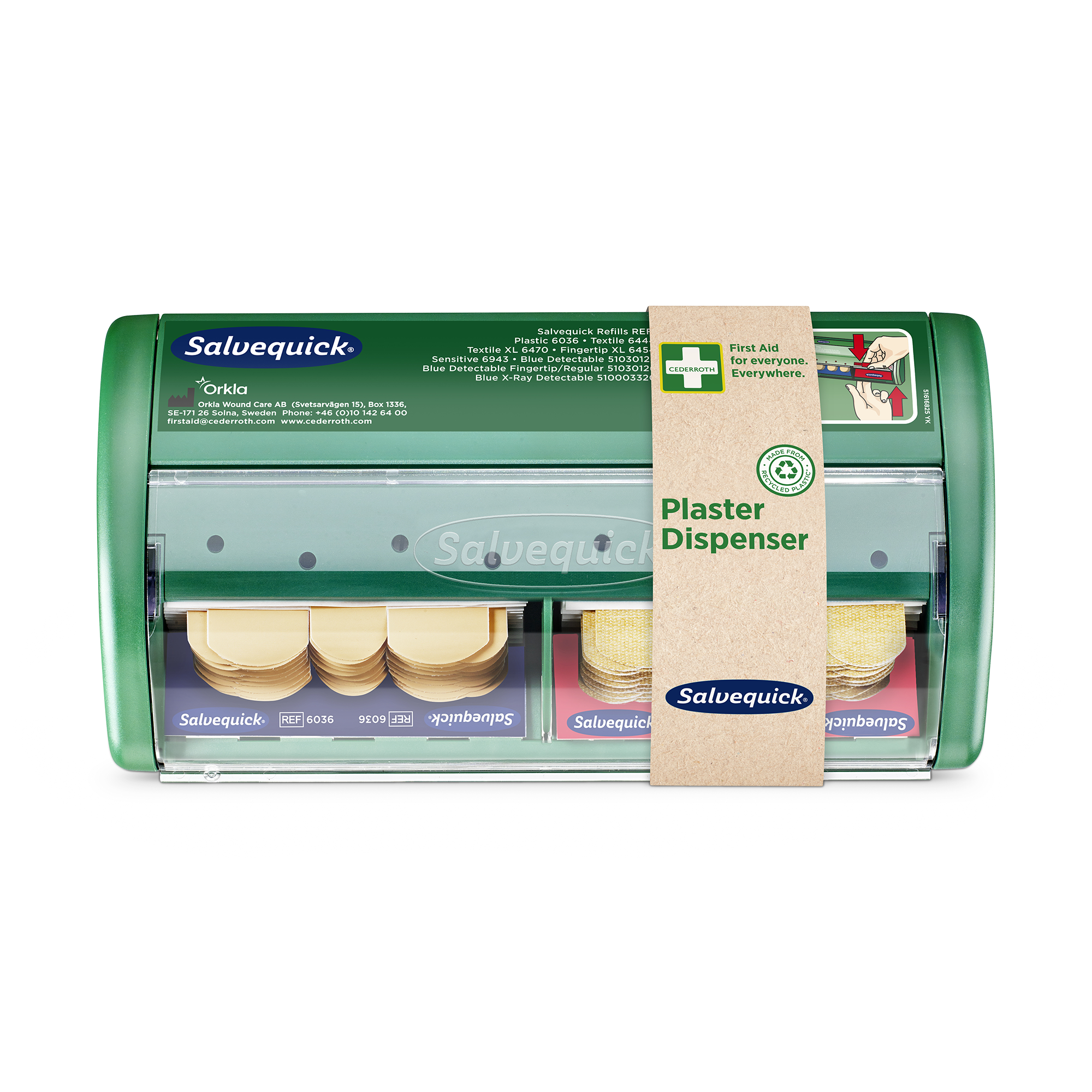 Salvequick plaastriautomaat koos täitepakenditega: 40 tekstiilplaastrit (6444) ja 45 plastikplaastrit (6036)