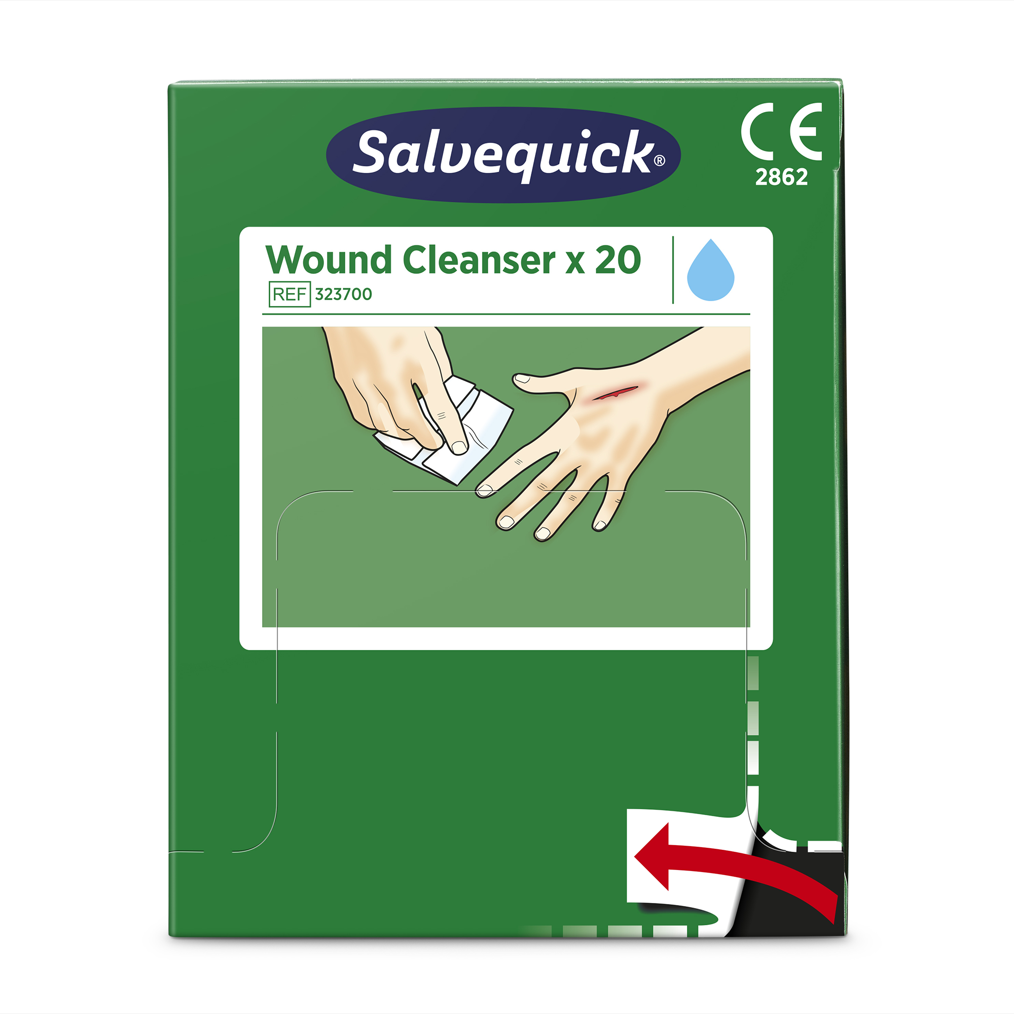 Salvequick haavapuhastuslappide pakend sobib täitepakendiks esmaabikappi.