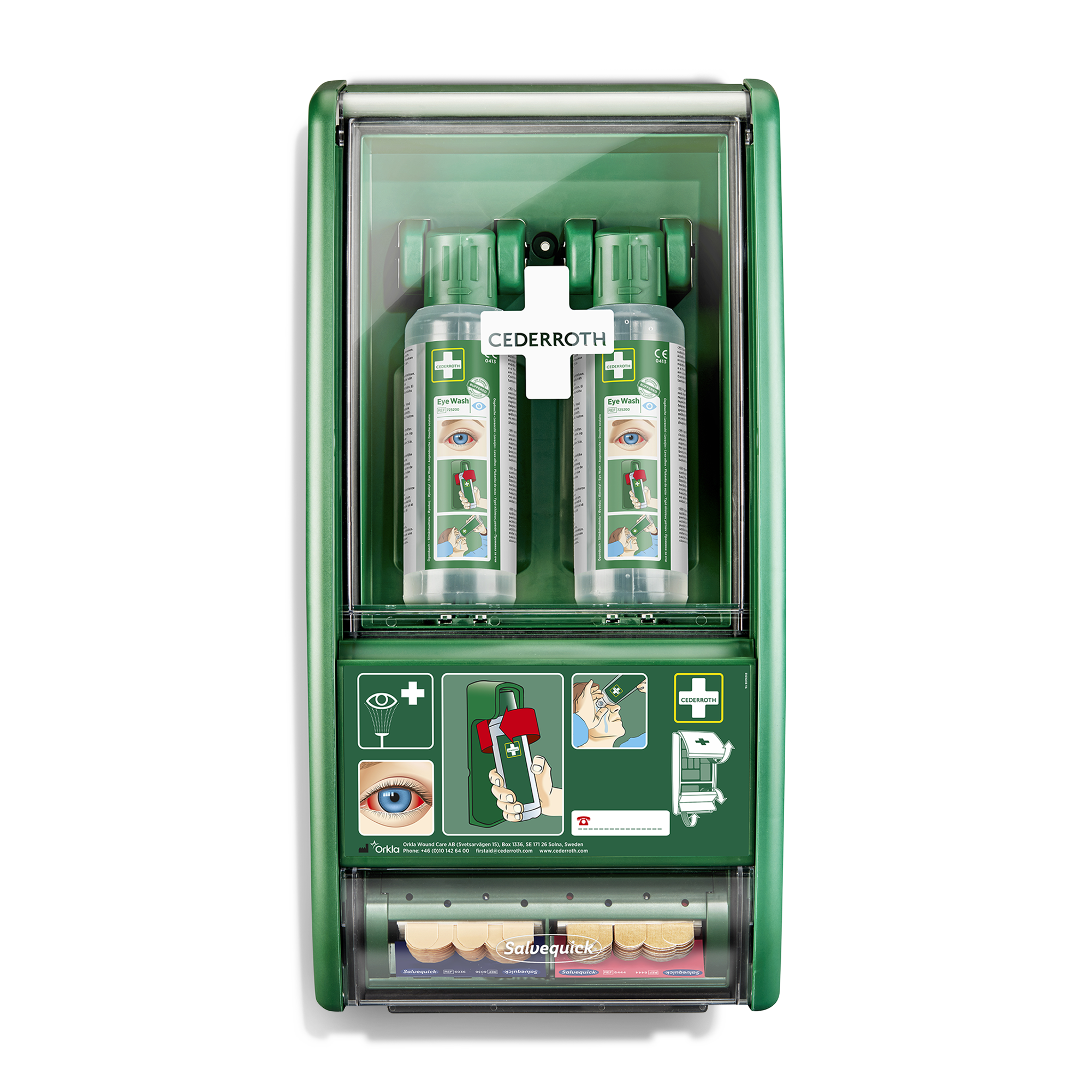 Meie silmaloputusvahend neutraliseerib silma pH väärtust, st sellel on neutraliseeriv toime leeliselistele või happelistele pritsmetele, andes kiirema tulemuse kui tavaline naatriumkloriidi lahus. Mõju on leeliste suhtes üldiselt tugevam kui hapete suhtes. Salvequicki plaastridosaatoriga on plaastrid alati käepärast ja kasutusvalmis. Tõmmake plaastreid allapoole, mis hoiab ära mustuse või vere sattumise teistele plaastritele. Täitepakendid on lukustatavad, et vältida raiskamist. Lisaruum teiste toodete jaoks tähendab, et saate oma jaama sisu kohandada vastavalt oma töökoha vajadustele.