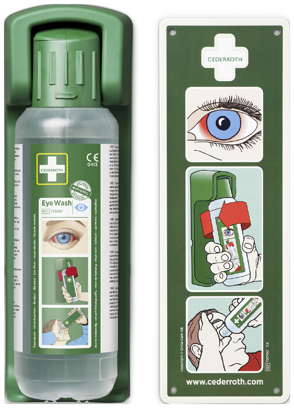 - Pudel on lukustatud seinahoidikusse ja avaneb automaatselt hoidikust välja pöörates – silmade loputamist saab kohe alustada.