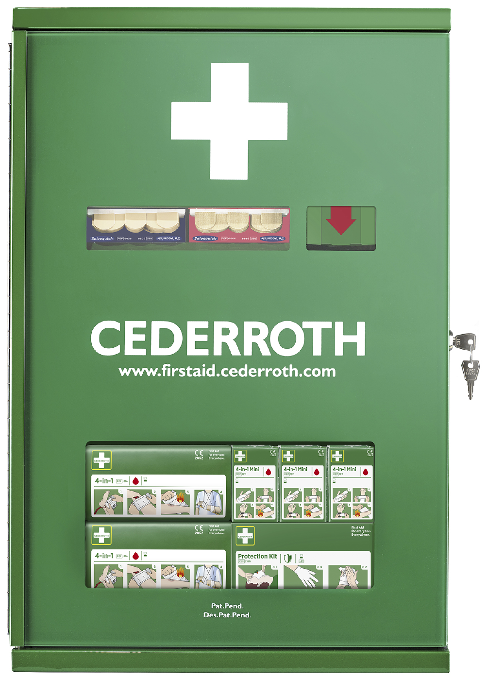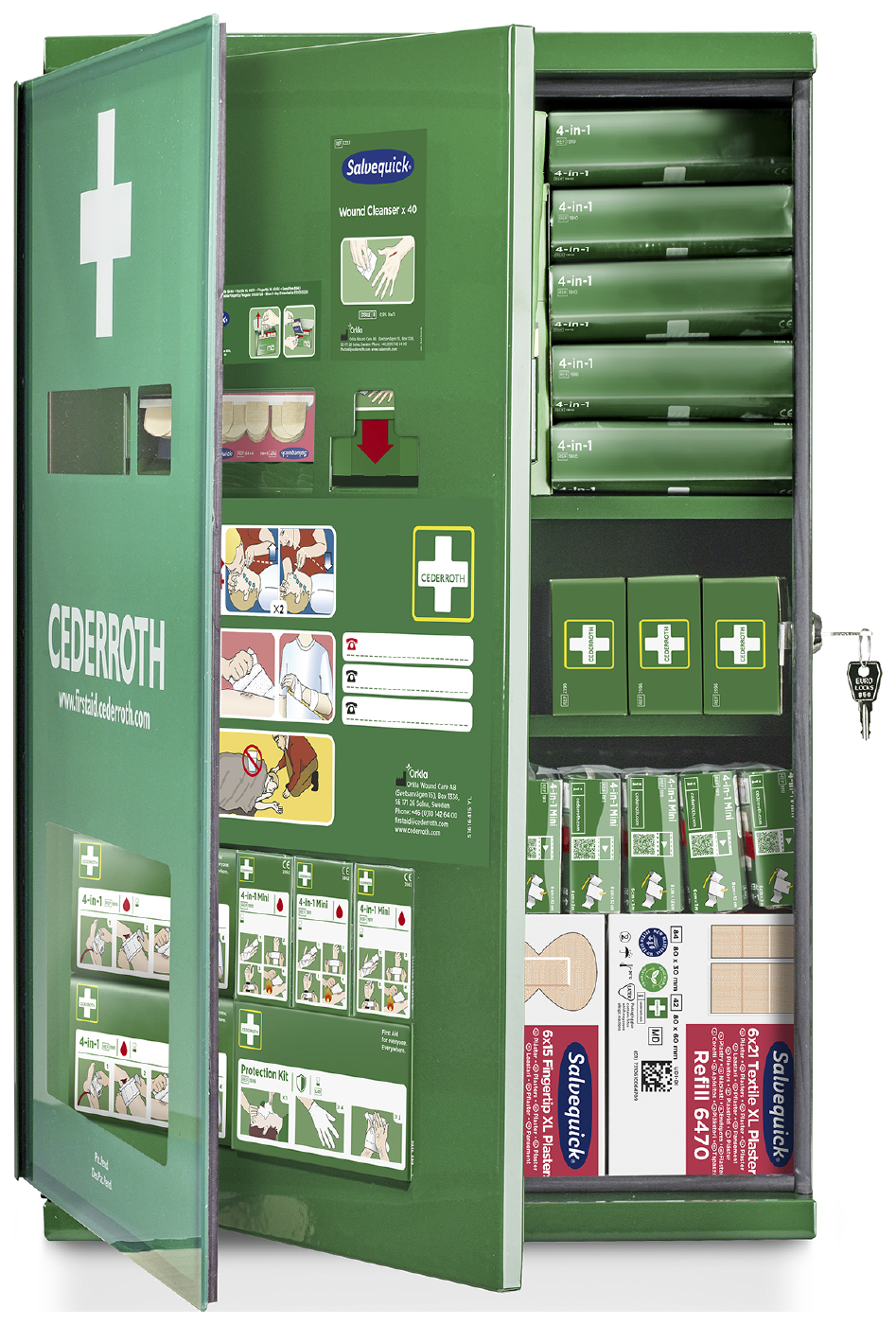 Tugevast roheliseks lakitud plekist lukustatav kapp. Cederrothi esmaabistendiga kappi on vaja igal töökohal. Lukustatavas kapis saab hoida esmaabistendide täitepakendeid, mille vahetamine peab käima kiiresti ja lihtsalt. Plaastri- ja haavapuhastusvahendi automaate on võimalik täita mõne sekundiga.Mõõdud: 38 x 58 x 17 cm.