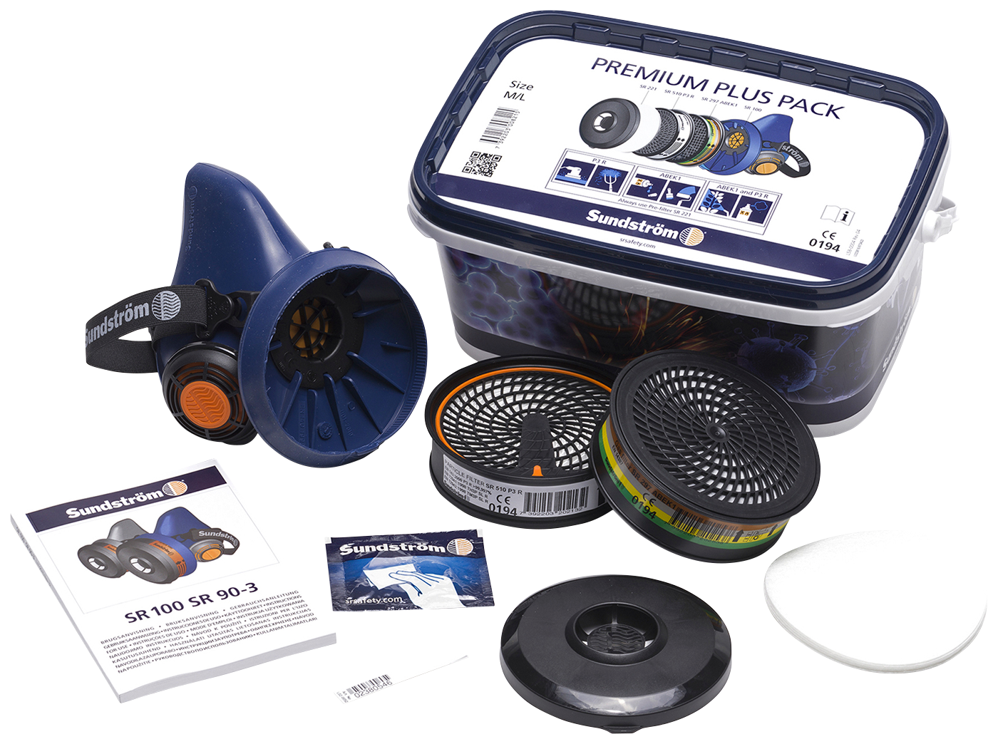 - Karbis on poolmask SR 100 M/L, osakestefilter SR 510 P3 R, gaasifilter SR 297 ABEK1, 5 eelfiltrit SR 221, eelfiltri hoidik, puhastusrätik ja kasutusjuhend.