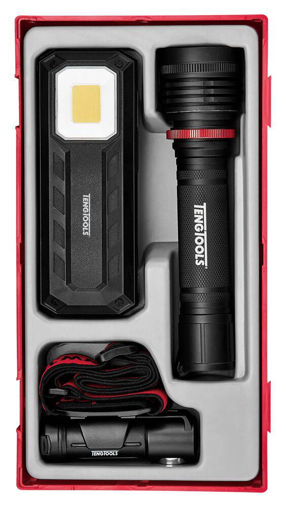 3-osaline LED-lampide komplekt. Komplektis on LED-taskulamp, töölamp ja pealamp. IP-klassiga disain ja reguleeritavad valgusrežiimid. Taskulamp 584N nelja valgusrežiimi ja 2.5–8-tunnise tööajaga. Töölamp 588N kahe valgusallika, reguleeritava kinnituskonksu ja tugeva kinnitamiseks mõeldud magnetiga. Laetav pealamp 400-luumenilise Cree LED-iga ja kinnitusklambriga, mida saab pöörata kuni 60°. Kõik lambid on varustatud magnetitega käed-vabad kasutamiseks. Laadimine USB-C kaudu kaasasoleva USB-C kaabli abil. Sisu on jaotatud tööriistamoodulisse suurusega 1 (TT1). Ühildub TengToolsi tööriistade hoiusüsteemiga.