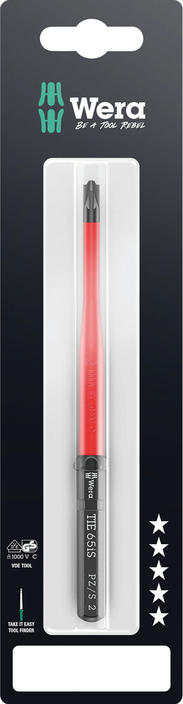 VDE varras Kraftform Kompakt käepideme / vahetatavate varraste süsteemile. Kombineeritud lapik- ja Pozidriv-profiil sobib kasutamiseks eelkõige klambritel, kaitsmekilpidel, lülititel, releedel. Välkkiire vardavahetus ilma eritööriistadeta. Testitud ükshaaval 10 000 V pingega, et tagada ohutu töö heakskiidetud pingel 1000 V. Vähendatud läbimõõdu ja integreeritud kaitseisolatsiooniga varras võimaldab hõlpsasti töötada sügaval asuvate kruvide ja vedrudega. Wera Black Point ots tagab täpse istuvuse ja optimaalse korrosioonikaitse. „Take it easy“ tuvastussüsteemiga: profiilile vastavad värvikoodid ja lasergraveeritud suurusemärgistus. Kuuekandiline veeremisvastane kuju takistab varraste soovimatut veeremist.