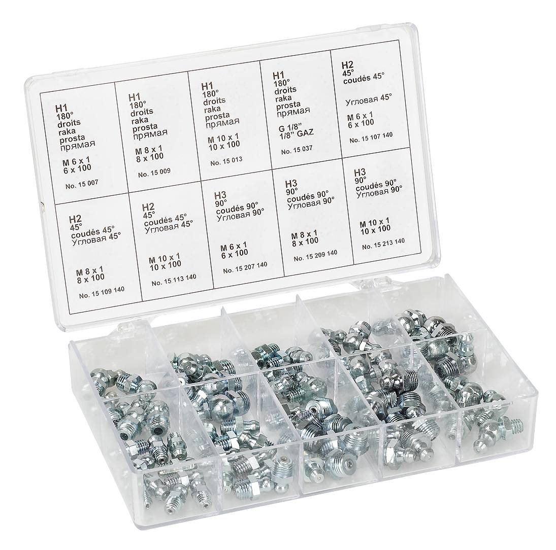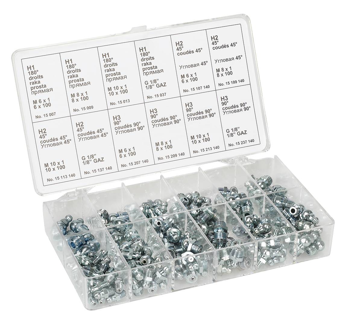 Nr 16090. Sortimendis 12 erinevat niplit (kokku 140 tk). M6×1, M8×1, M10×1, G (R) 1/8 sirge, 45° ja 90° mudel. Plastkarbis.