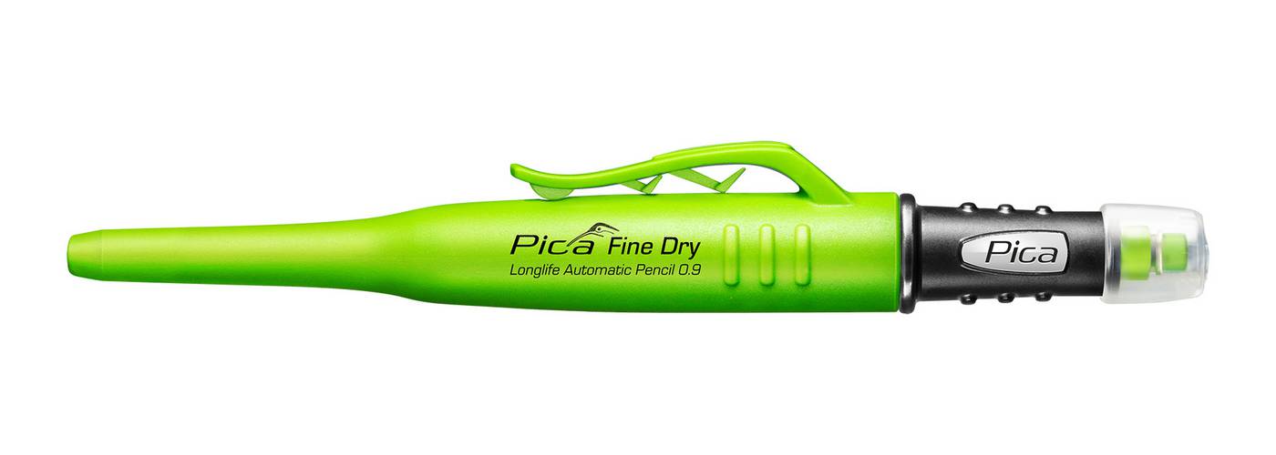 Pica Fine Dry sobib ideaalselt peeneks ja täpseks märgistamiseks ilma teritamiseta tänu väiksele läbimõõdule, mis on vaid 0.9 mm. Pliiatsil on kaasas 5 grafiitsüdamikku kõvadusega HB. Integreeritud suur kustutuskumm võimaldab kiiresti märgistust parandada. Sisseehitatud tolmu- ja veekaitse (kübarakujuline surunupp ja tihendusrõngas silindril) kaitseb pliiatsi sisemist mehhanismi välismõjude eest ehitusplatsil ja pikendab oluliselt pliiatsi kasutusiga. Väga vastupidavast plastist valmistatud tugeva klambriga otsakate hoiab pliiatsit kindlalt püksitasku küljes ja võimaldab seda igal ajal hõlpsasti ühe käega käsitseda.