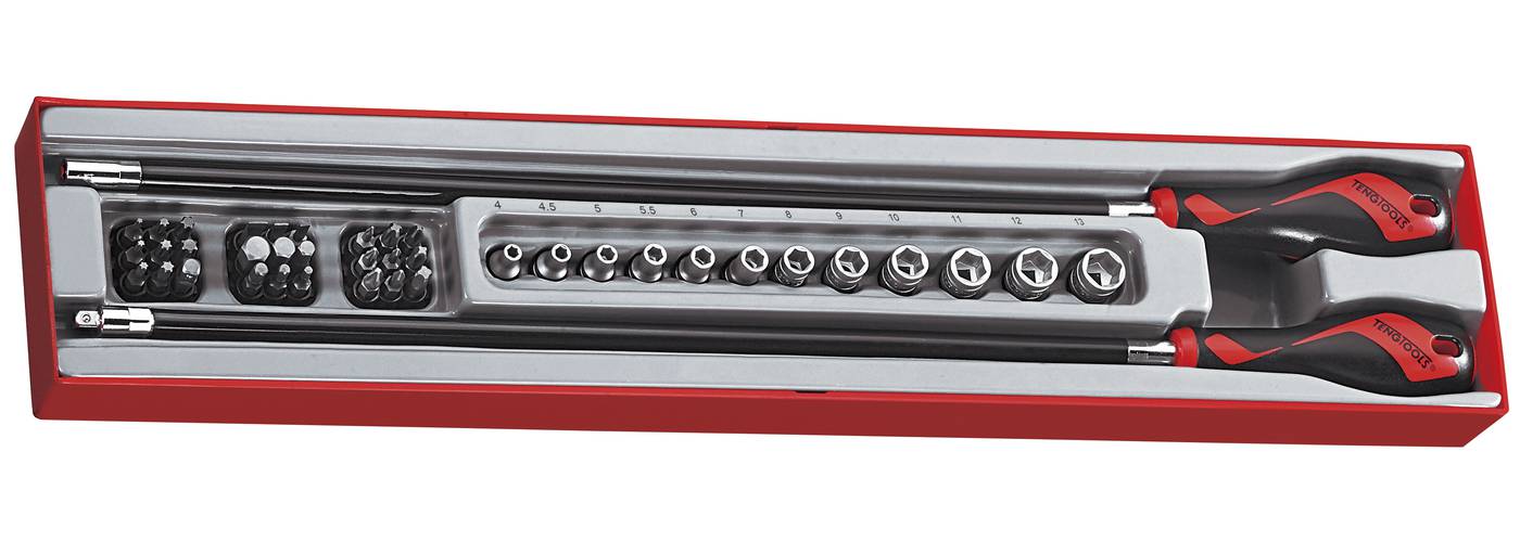41 osaline komplekt. Komplektis on otsakkruvits 1/4” kinnitusega kuuskantotsakutele, 1/4” kinnitusega kruvitsakäepide, 27 tk 25 mm pikkuseid otsakuid ja 12 tk 1/4” padruneid. Tarnitakse eemaldatava kaanega moodulkastis. Sobib Teng Toolsi tööriistakastidesse ja tööriistakärudesse.