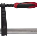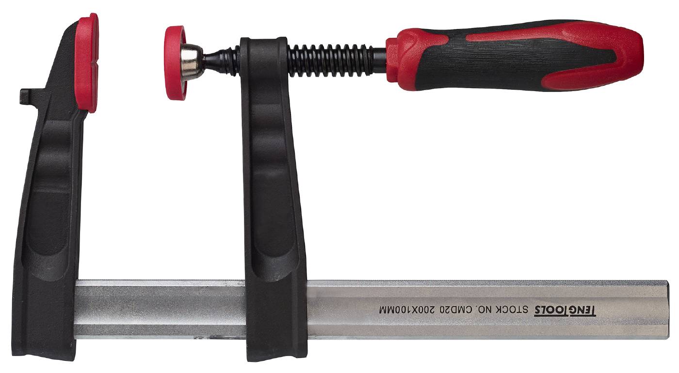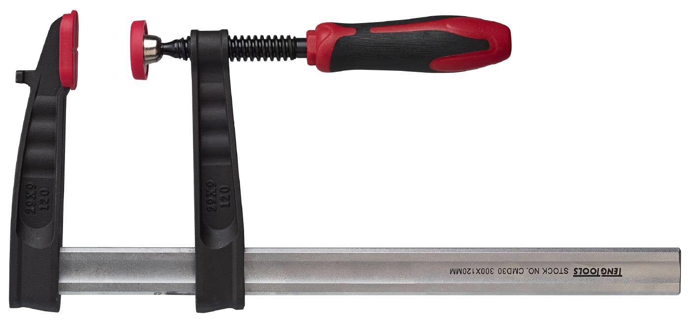 Pitskruvid tempermalmist liughaaradega.. Profileeritud hammastatud latt. Tugeva keermega pruuniks töödeldud kruvil on kuulliigendiga surveseib. Survepindadel on plastkatted. Kahekomponentsest plastist käepide.