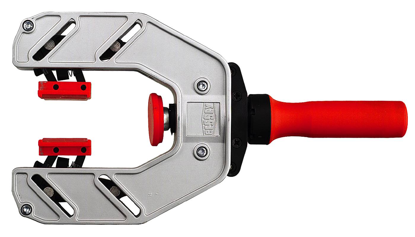 Ühekäepitskruvi, mis pingutab samaaegselt kolmest küljest. Alumiiniumraam. Ergonoomilise kujundusega käepide. Kasutamiseks ääreliistude liimimisel plaatmaterjalile jms.
