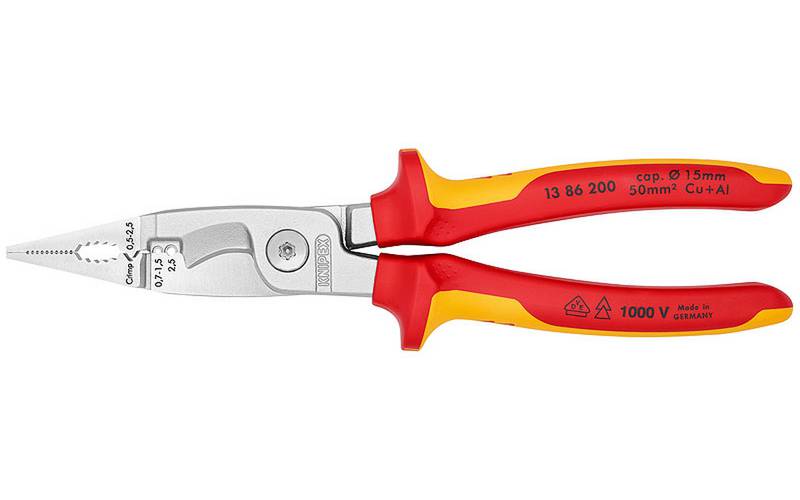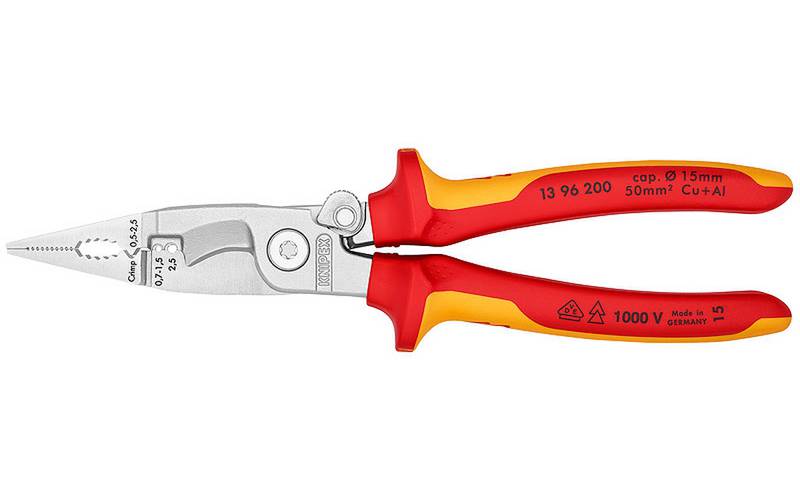 6 funktsiooni ühes tangipaaris. Multifunktsionaalsed tangid elektripaigaldustöödeks; lapik- ja ümarmaterjali haaramiseks, kaabli painutamiseks, kraatide eemaldamiseks, kaabli lõikamiseks, otshülsside eemaldamiseks ja pressimiseks. Siledad haardepinnad otste lähedal hoiavad üksikuid kaablisooni neid kahjustamata; hammastatud haardepinnad ja toruhoidik lapik- ja ümarmaterjali haaramiseks. Mokkade sirgeservalised välispinnad süvistatud harukarpide töötlemiseks ja kaabliavade silumiseks. Koorimissälgud kaablitele 0,75…1,5 mm² ja 2,5 mm². Pressprofiil otshülssidele 0,5…2,5 mm². Induktsioonkarastatud täppisteritatud lõikeservadega kaablikäärid vask- ja alumiiniumkaablitele kuni 5 x 2,5 mm² / läbimõõdule 15 mm. Tangidega saab haarata ilma neid täielikult avamata, tänu vedruga varustatud versiooni nutikale narremehhanismile. Lõikeserv jääb suletuks ja kaitstuks. Sale kuju hõlbustab juurdepääsu. Tänu poltliitele on tangid ilma lõtkuta. 276710506 – Mudelitel, mille liigendis on avamisvedru, hoiab aktiveeritud lukustushoob lõikeservad suletuna, samal ajal kui muud funktsioonid jäävad aktiivseks. Intelligentne lukustusmehhanism võimaldab tange avamata ”haarata”. Lõikeserv jääb suletuks ja kaitstuks. 276710100 – Tangid, millel on isoleeritud kinnituskoht kukkumiskaitse kinnitamiseks.