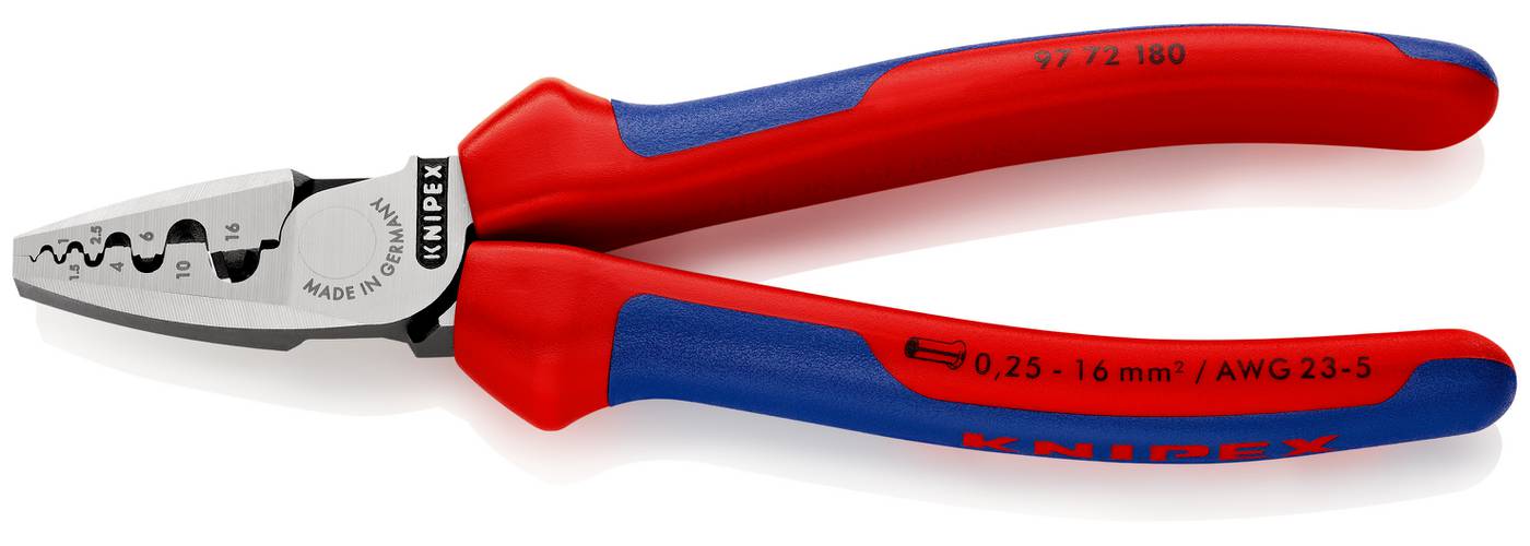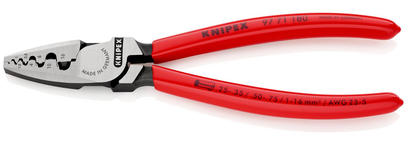 180 mm pikkused tangid hülsside kinnitamiseks kaablitele. Kerge ja sale disain. Saadaval ka VDE versioonis. Kerge pressida tänu optimaalsele jõuülekandele. Hülsside pressimiseks vastavalt DIN 46228 osadele 1 ja 4. Ristlõikele 0.25…16 mm². Edasiarendatud jõuülekanne tagab 30% väiksema jõukulu. Kerge ja sale disain. Pressimine toimub markeeritud poolümaras pesas ning tagab kontakti hülsi ja juhi vahel. 9 eriti sügavat kooniliste külgedega pesa. Eritööriistaterasest. Vormstantsitud ja õlis karastatud.