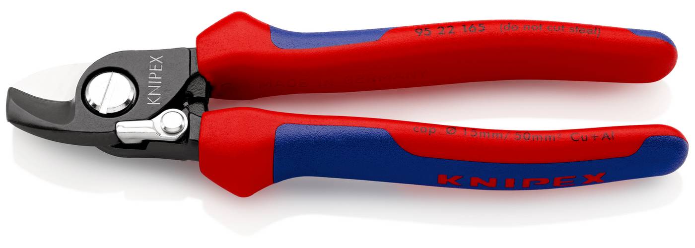 KNIPEX kaablikäärid vasest ja alumiiniumist ühe- ja mitmetraadiliste kaablite lõikamiseks. Lõikab puhtalt ilma muljumata. Ei sobi terastraadi ja kõva vasktraadi lõikamiseks. Karastatud täppislihvitud lõiketerad. Ühe käega lihtsalt kasutatavad. Sõrmekaitsega. Reguleeritav poltühendus, stopperkruvi. Sisemine avamisvedru on hästi kaitstud. Kõrgekvaliteedilisest eriterasest. Vormstantsitud ja õlis karastatud.