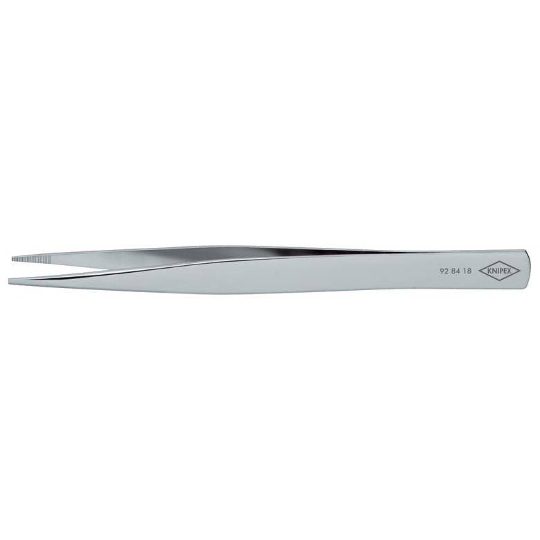92 84 18: Montaažipintsetid. Ristkülikulised u. 0.9 mm laiused otsad. Haardepinnad peene põikrihveldusega. Nikeldatud. Kõrgtugevast vedruterasest.