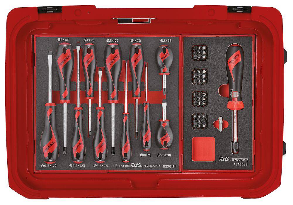 Komplektis on lehtsilmusvõtmed 8 mm kuni 19 mm, tangid, momentkruvits, kruvitsad, otsakud ja needitangid. Tarnitakse unikaalses Teng Toolsi tööriistakohvris, mis sisaldab kuus Teng Toolsi moodulit FOAM1 ja FOAM2. Tööriistade jaoks on lõigatud pesad kolmevärvilisse EVA-vahtplasti, mis näitab selgelt, milline tööriist kuhu kuulub. Koodluku ja turvaliste kinnitustega vastupidav lennukikohvri stiilis kohver. Kaasas kandmist hõlbustavad rattad ja väljatõmmatav käepide.