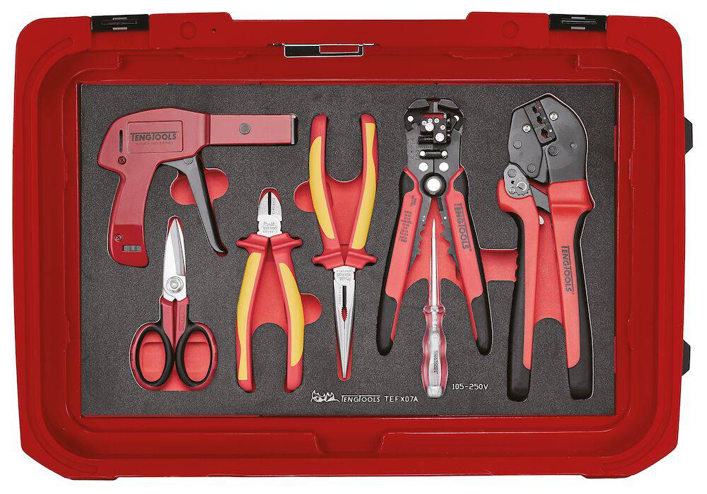 Komplektis on padrunid 8 kuni 20 mm, vahetatavate varrastega momentkruvits, võtmed 7 kuni 24 mm, tangid, käärid, klemmitangid, kaablikoorija, tester ja kaablisidemetangid. Tarnitakse unikaalses TengToolsi hoolduskohvris, milles tööriistad paiknevad spetsiaalselt hoolduskohvri jaoks loodud kolmes moodulis FOAM3. Tööriistade jaoks on lõigatud pesad kolmevärvilisse EVA-vahtplasti, mis näitab selgelt, milline tööriist kuhu kuulub. Koodluku ja turvaliste kinnitustega vastupidav lennukikohvri stiilis kohver. Kaasas kandmist hõlbustavad rattad ja väljatõmmatav käepide.