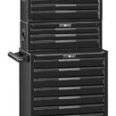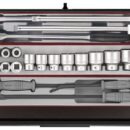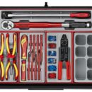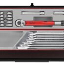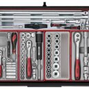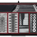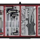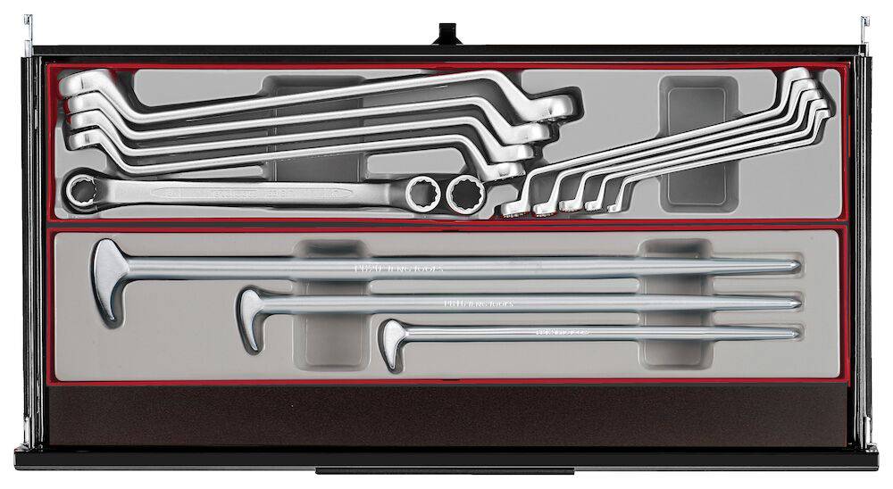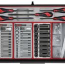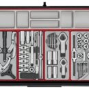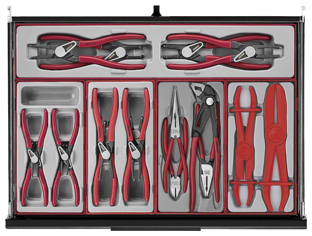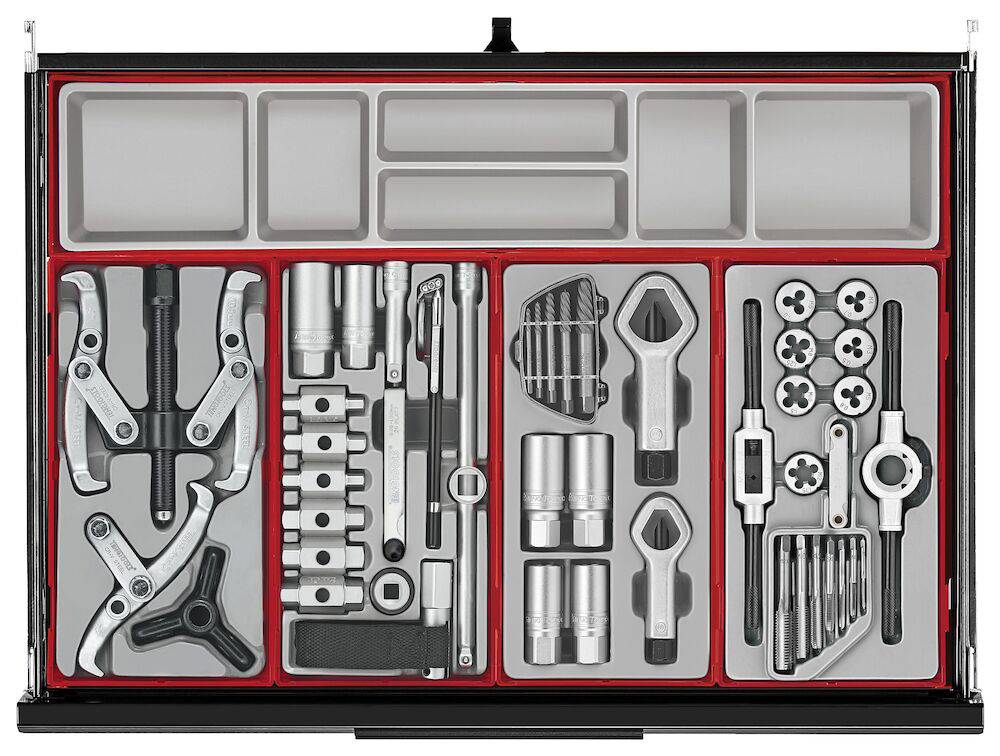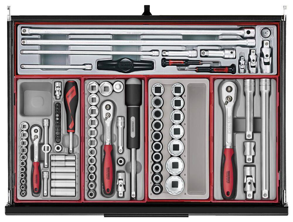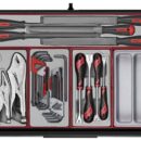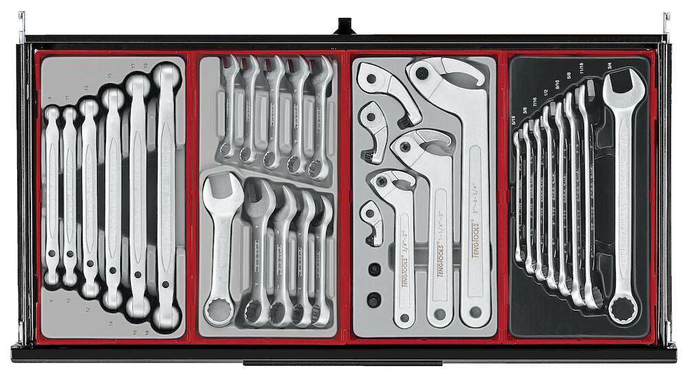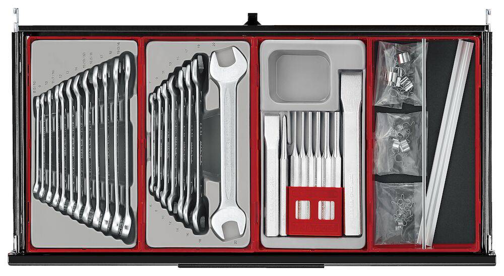 TengTools TKS26B1033T on 1033-osaline Mega Master 26” PRO35™ tööriistakomplekt 16 sahtlis, millel on kolmeastmelised kuulliugurid ja kandevõime 30 kg. Sahtlid on kolmeosalises kvaliteetterasest korpuses, mis on läbinud viieastmelise fosfaadivaba roostekaitsetöötluse ja kaetud pulbervärviga. Tugevad viietollised rattad, EVA vahtplastist sahtlimatid ja kolmekohalised koodlukud igal sektsioonil. Põhjalik tööriistakomplekt, mis sisaldab padruneid, mutrivõtmeid, kruvitsaid, tange ja eritööriistu paljude erinevate mehaaniliste ülesannete jaoks. Põhineb TengToolsi modulaarsel tööriistade hoiusüsteemil, mis muudab lihtsaks tööriistade korrastamise ja annab märku puuduvast tööriistast.