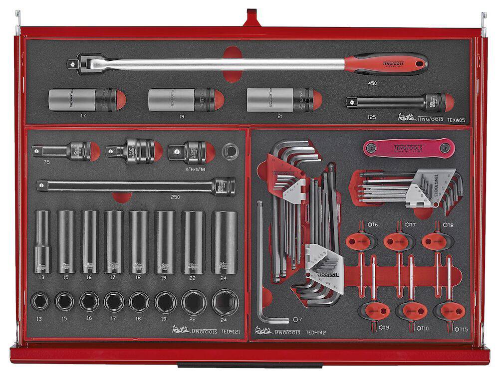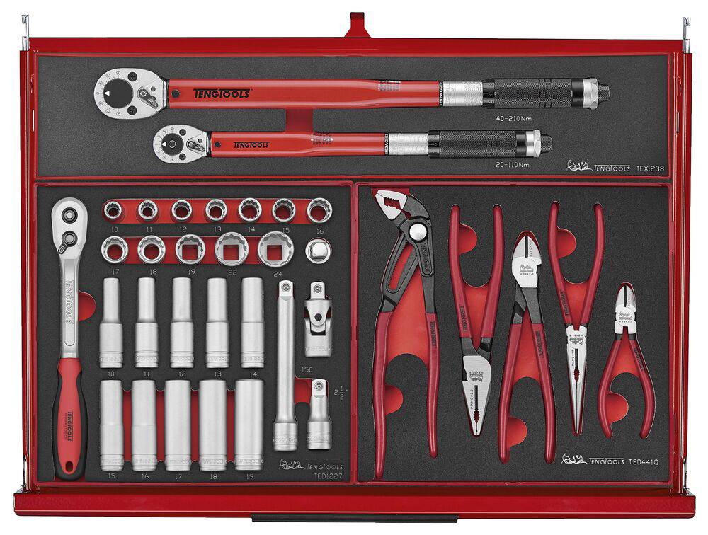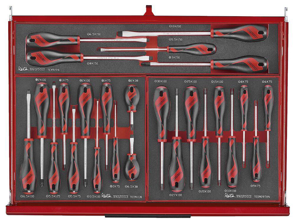 Tööriistakomplekt TengTools TKS26R418F on 418-osaline erinevate tööstuses kasutatavate tööriistadega 26” virnastatav süsteemis, mis on läbinud viieastmelise fosfaadivaba roostevastase töötluse ja kaetud punase värviga. Kvaliteetterasest tööriistakärus ja -kastis on 11 sahtlit. Sisaldab tööstuse jaoks kõige olulisemaid tööriistu, mis on jaotatud suure tihedusega EVA vahtplastist moodulitesse. Varustatud vastupidavate ratastega (5”), kolmekohalise koodluku ja mugava käepidemega. TengTools Tööriistade hoiusüsteem.