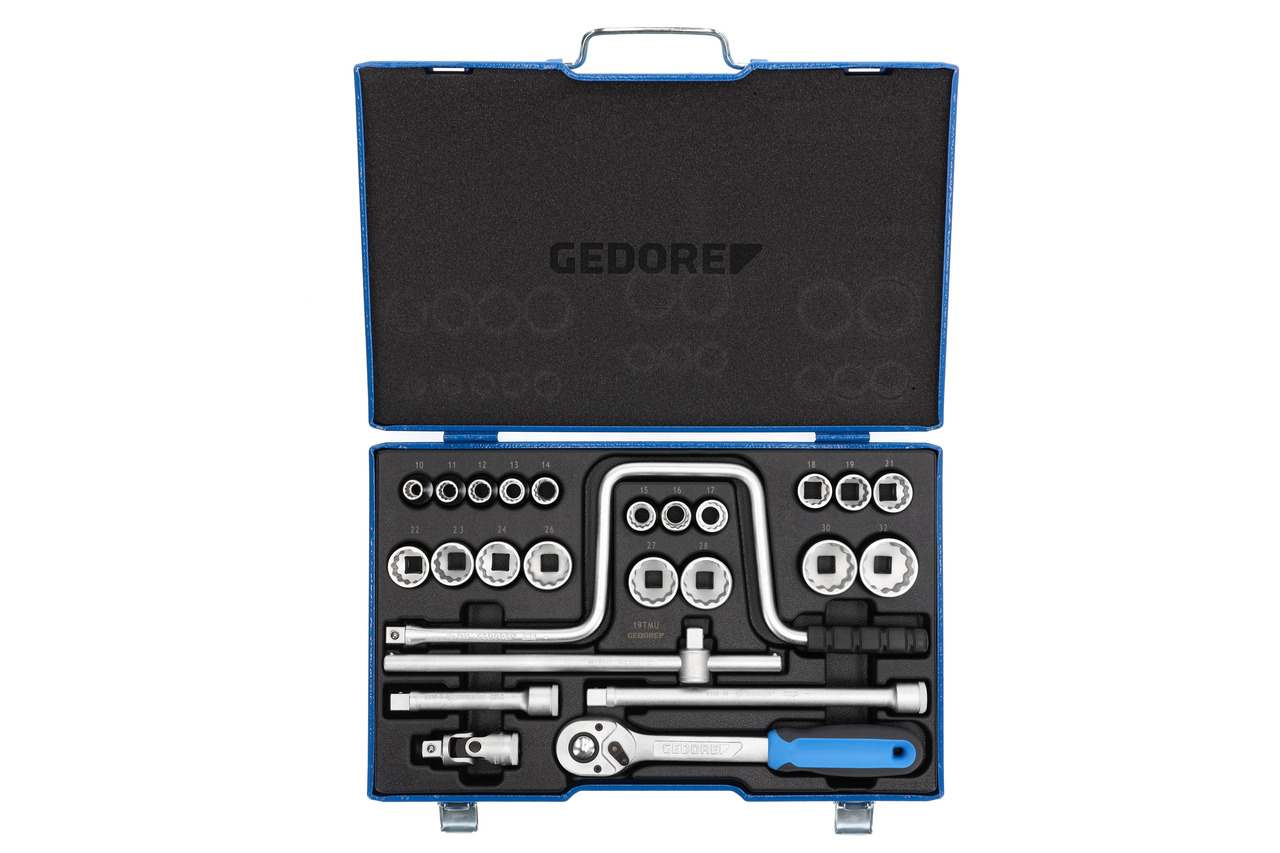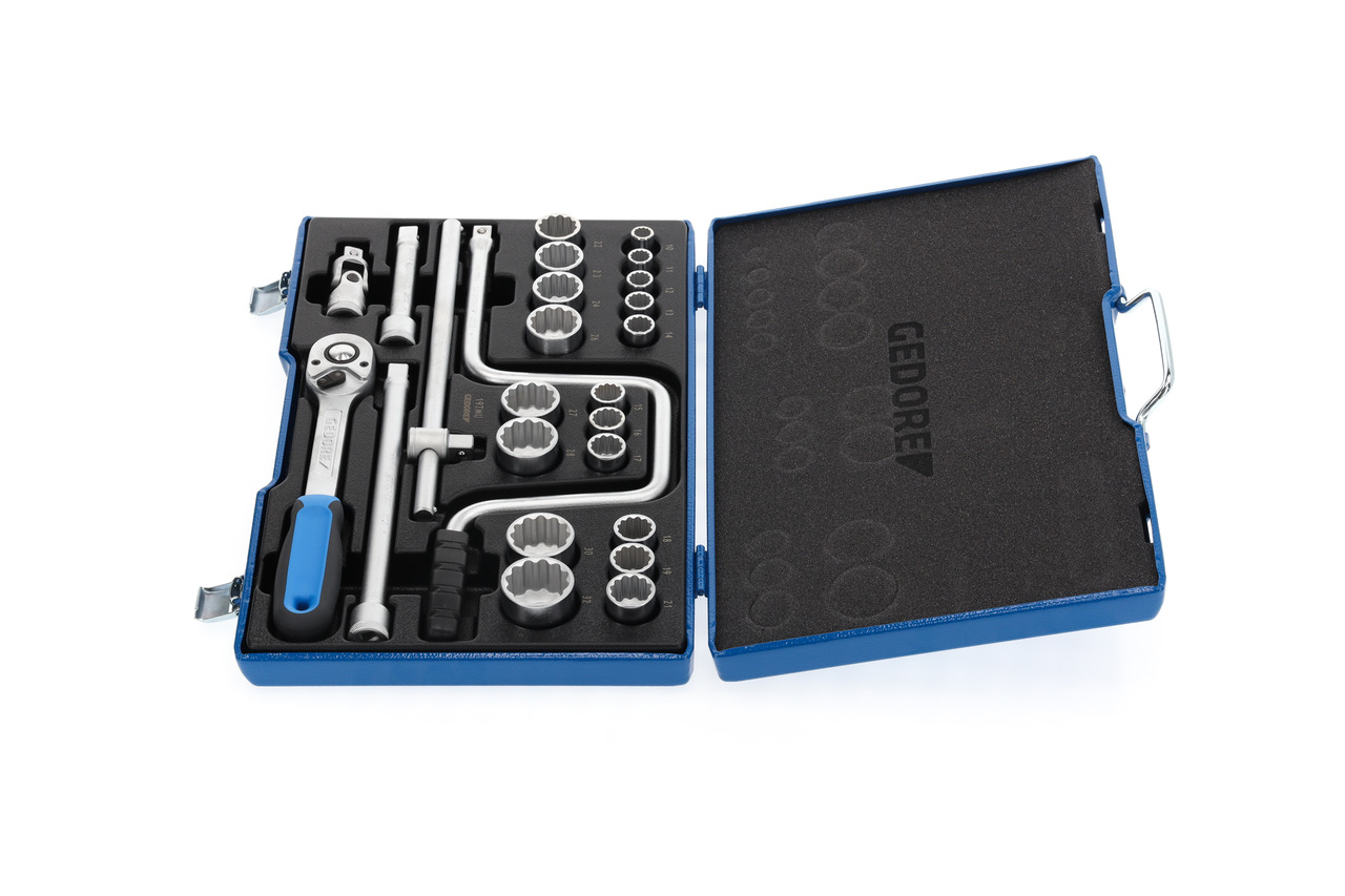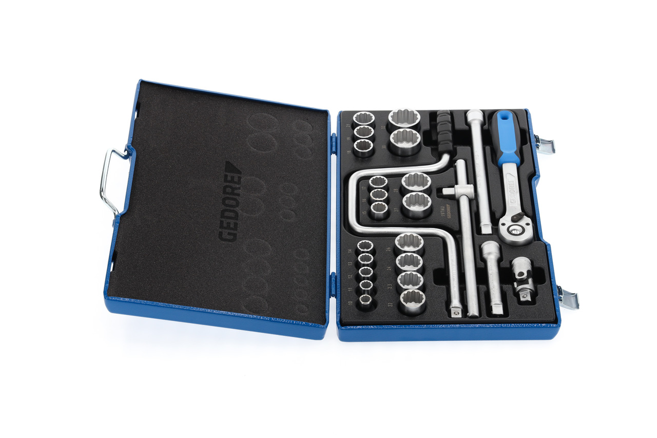 UD-profiiliga sepistatud karastatud kuuskantpadrunid (nr 19) või kahesuunalised kuuskantpadrunid (nr D 19), käsitsi kasutamiseks. Vanaadiumterasest 31CrV3 tarvikud. Tugev pööratav narre koos suunavaheti ja vabastusnupuga. GEDORE sinises plekk-kohvris. Mõõdud: 425 x 277 x 55 mm.