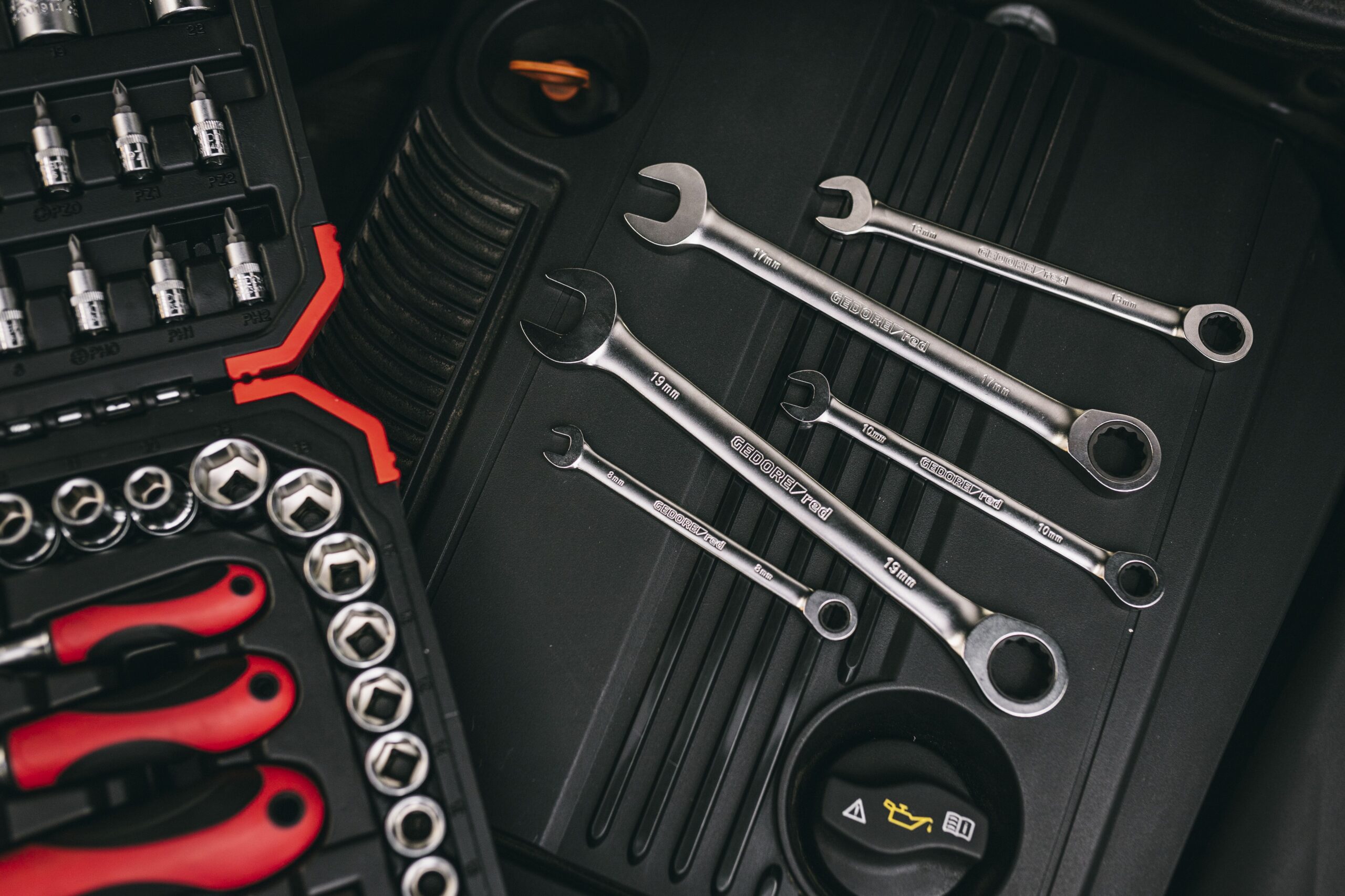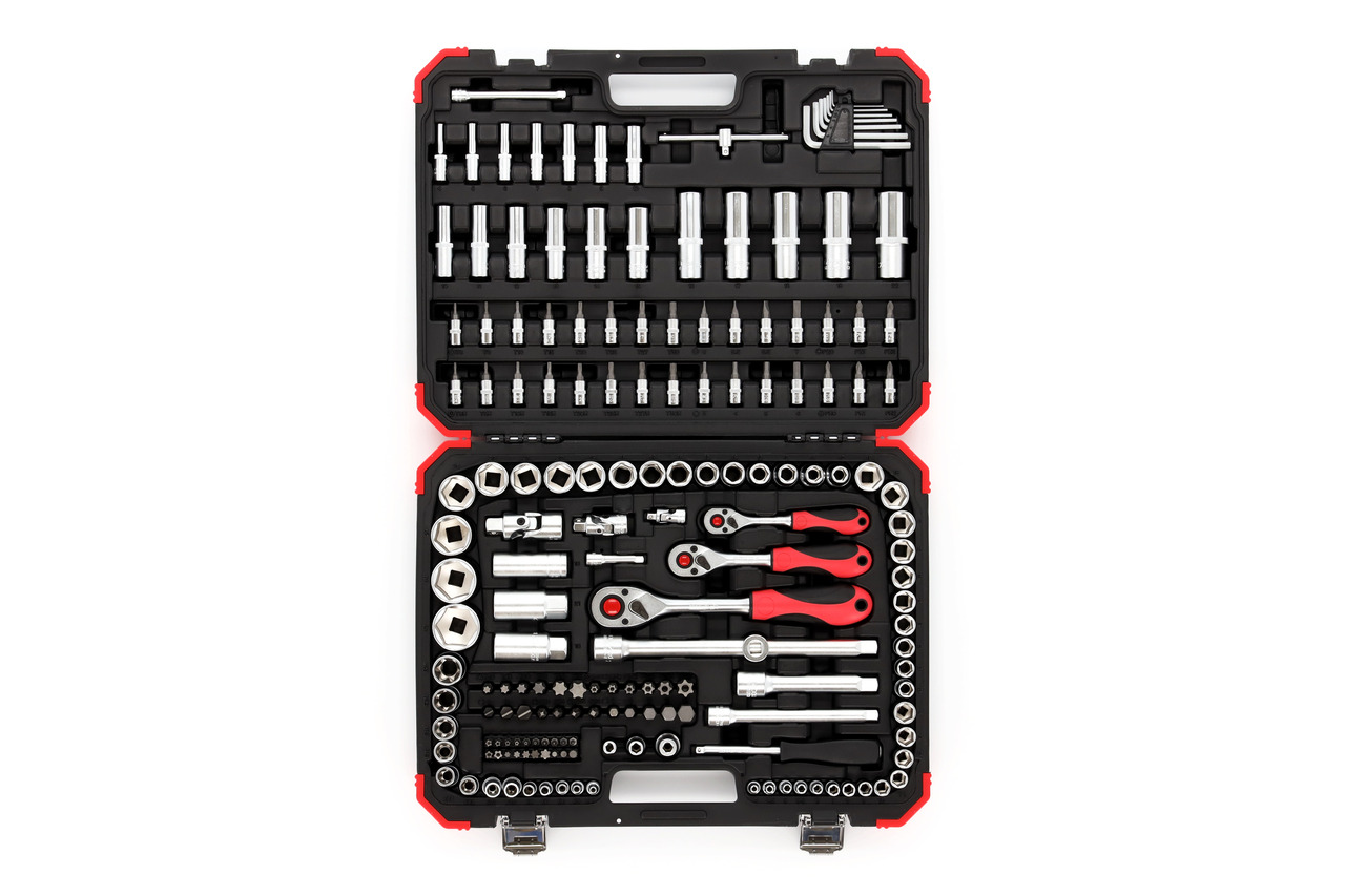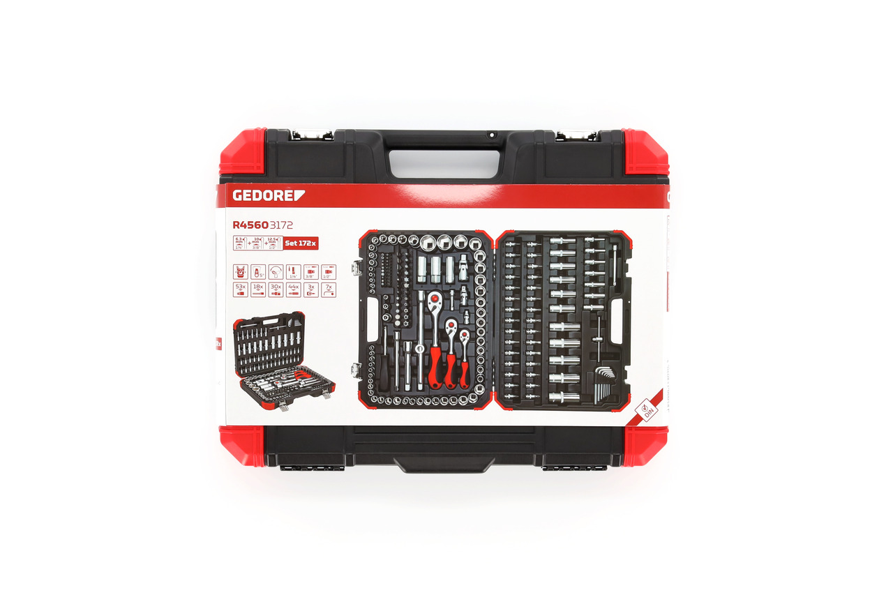 Standardile DIN 3120, ISO 1174 vastav liigend, kuulkinnitusega. Standardile DIN 3120, ISO 1174 vastav nelikantühendus, kuulisoonega. 2C pööratav narre, parema ja vasaku käe suunavahetushoob, vabastusnupp, tihe hammastus, ovaalne pea, kahest materjalist käepide, käesõbralik jõuedastus, padrunitele. 1/4″ nelikant-siseotsaga käepide. Sisenelikandiga ühekomponentne käepide. Padrun, kuuskant, meetermõõdustik, lühike, vastab standardile DIN 3124, ISO 2725. Padrun, kuuskant, meetermõõdustik, pikk, vastab standardile DIN 3124, ISO 2725. Süvistatud TX-padrun. 3/8″ süüteküünlapadrun pressitud hoidekummi ja täiendava kuuskantühendusega, suurus 21. 1/2″ süüteküünlapadrun pressitud hoidekummiga. 1/2″ süüteküünlapadrun pressitud hoidekummi ja täiendava kuuskantühendusega, suurus 24. Padrunotsak 1/4″, kuuskantkruvidele, pressitud fosfaatotsaga. Lapikkruvitsa 1/4″ padrunotsak, pressitud fosfaatotsaga. PH-kruvitsa 1/4″ padrunotsak, pressitud fosfaatotsaga. PZ-kruvitsa 1/4″ padrunotsak, pressitud fosfaatotsaga. TX-kruvitsa 1/4″ padrunotsak, pressitud fosfaatotsaga. Puuravaga TX-kruvitsa 1/4″ padrunotsak, pressitud fosfaatotsaga. Liuguriga 1/4″ T-käepide, vastab standardile DIN 3122, ISO 3315. Padruni pikendus 1/4″ + 3/8″ + 1/2″. Kardaanliigend 1/4″ + 3/8″ + 1/2″, keermega liigend, vastab standardile DIN 3123 (C 12.5). Konverter/liugur 3/8″ x 1/2″ padrunite ja kruvikeeraja padrunotsakute keeramiseks. 1/4″ otsakuadapter, sisenelikandi ja sisekuuskandiga, kõikidele 1/4″ välise kuuskandiga otsakutele ja tööriistadele. 3/8″ otsakuadapter, sisenelikandi ja sisekuuskandiga, kõikidele 5/16″ välise kuuskandiga otsakutele ja tööriistadele. 1/2″ otsakuadapter, sisenelikandi ja sisekuuskandiga, kõikidele 5/16″ välise kuuskandiga otsakutele ja tööriistadele. 1/4″ TX, TX BO otsak, TX-turvakruvidele, BO, soonega. XZN hoidikule vastavalt standardile DIN 1173, ISO 6.3. 5/16″ otsak, sisekuuskant, lapik, PH, TX, TX BO hoidikule vastavalt standardile DIN ISO 1173 (D 8). L-võtmete komplekt, vastab standardile DIN ISO 2936. Sobib kõikideks hooldustöödeks, oskustöölistele ja töökotta. Kroomvanaadiumteras, kroomitud, satiinmatt. GEDORE punase kujundusega plastkohver. Klambriga kinnitatud tööriistad.