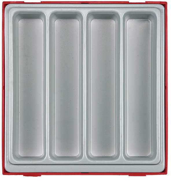 Sisseehitatav 4 vahejaotustega. Plastist. Äravõetava kaanega. Mitut karpi saab kokku ehitada.
