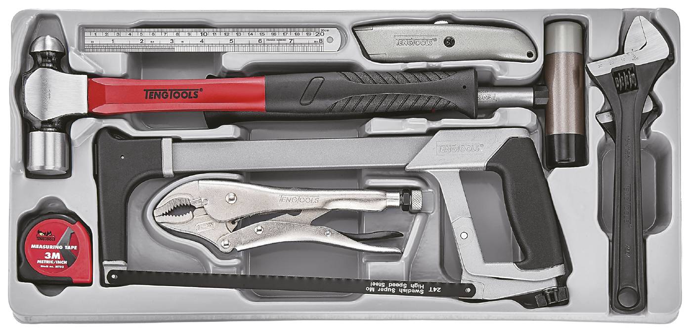 Tööriistakomlekti kuulub 9 tööriista: 2 tellitavat võtit, universaaltangid, universaalnuga, rauasaeraam, plasthaamer, mõõdulint, terasjoonlaud ja kuulhaamer.