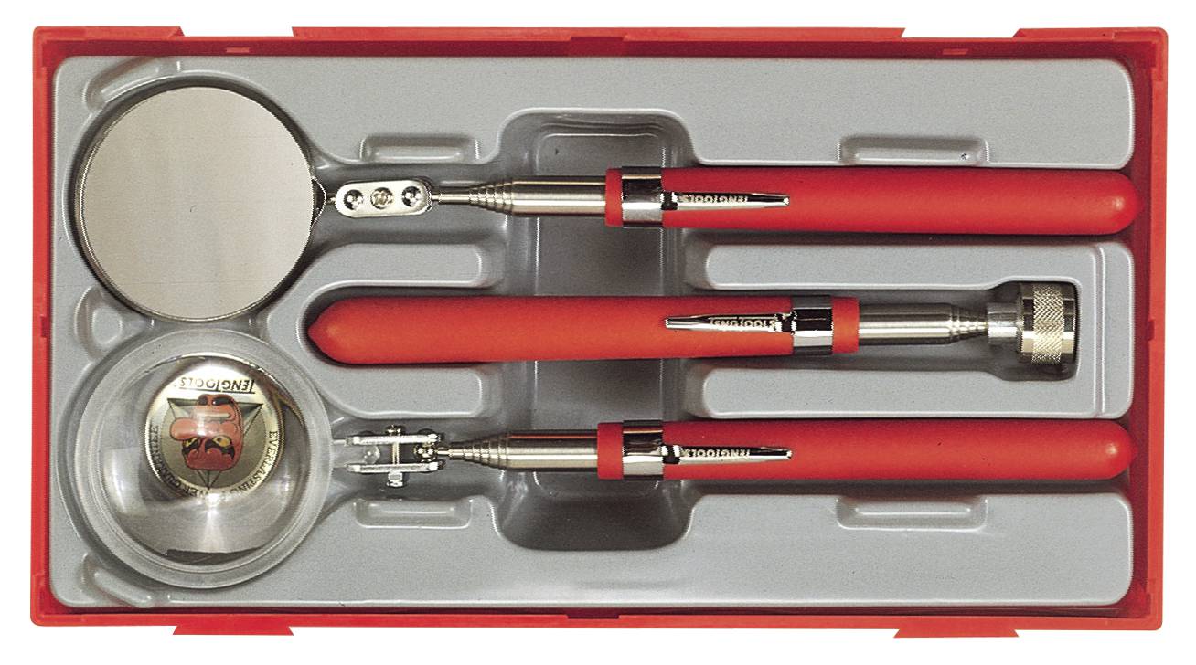 Sisaldab kolme telekoopvaatlusriista – vaatluspeegel, suurendusklaas ja magnet. Taskuklambriga.