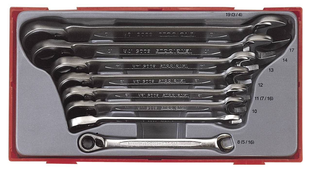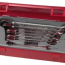 Komplektis on 8 võtit. Kroomvanaadiumterasest. Kombineeritud lehtvõti ja 12kant silmusnarrevõti. Vasak-parem-ümberlülitusega. Sama võtmemõõt mõlemas otsas.