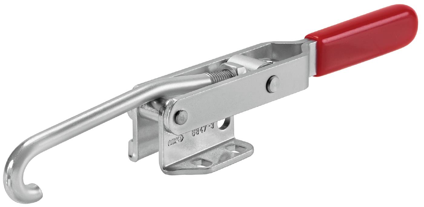 Töötab põlvliigendi põhimõttel. Horisontaalselt töötav konks sulgemiseks ja tõmbamiseks. Horisontaalne kinnitusplaat. Plastiga kaetud käepide, Tsingitud. AMF sulgurklambrile Nr 6847 sobib AMF vastaspool Nr 6847 G, kinnitamiseks eseme külge, mida tuleb sulgurklambriga 6847 tõmmata/sulgeda.