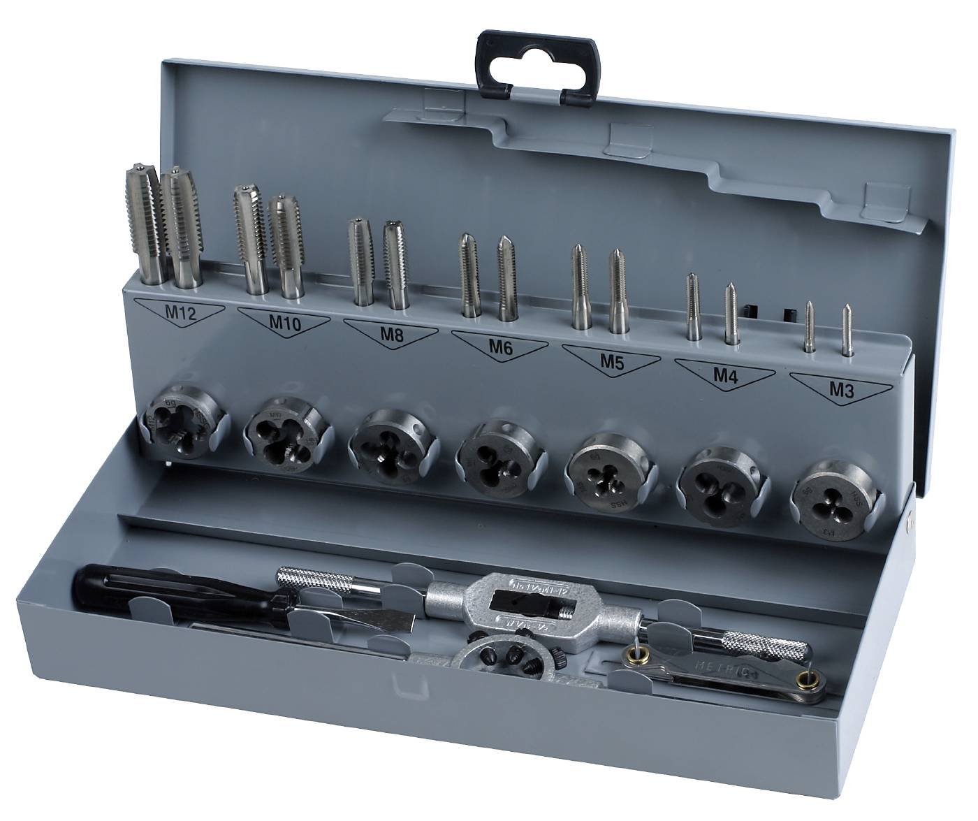 16341208 Komplekt kiirlõiketerasest keermeriistadega. Igast mõõdust on 2 keermepuuri (nr 2 ja nr 3) ja 1 keermelõikur (välisdiameeter DIN 223 järgi), samuti 5 keermelõikurivõtit, 2 keermepuurivõtit ja 7 puuri.