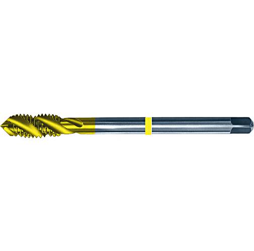 917. Materjaliga sobitatud keermepuur. (Kollane) rauale, pehmele terasele, konstruktsiooni- ja madalalt legeeritud terasele kuni 800 N/mm². Parema käe spiraalsoon toob laastud välja materjali pinnale. Umbavade keermestamiseks. Spiraalinurk 40°.