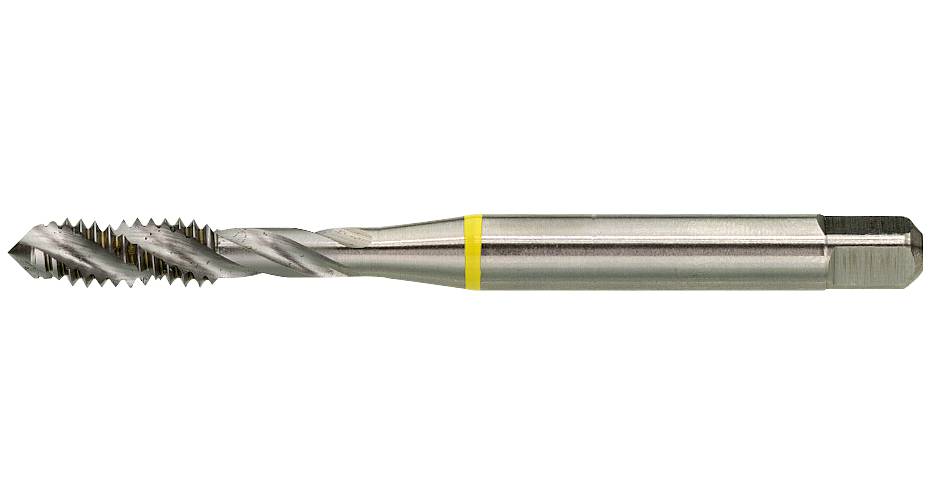 876. Materjaliga kohandatud keermepuur. (Kollane) rauale, pehmele terasele, konstruktsiooni- ja madalalt legeeritud terasele kuni 800 N/mm². Parema käe spiraalsoon toob laastud ava pinnale välja. Umbavade keermestamiseks. Spiraalinurk 40°.