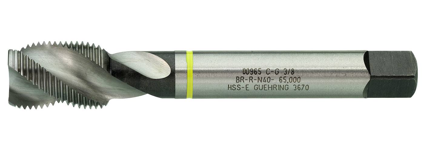 965. Materjalile kohandatud keermepuur (Kollane) pehme terase, konstruktsiooni- ja madallegeeritud terase jaoks kuni 800 N/mm². Parempoolsed spiraalsooned toovad laastud august välja. Põhjaga aukude jaoks. Spiraali nurk 40°.