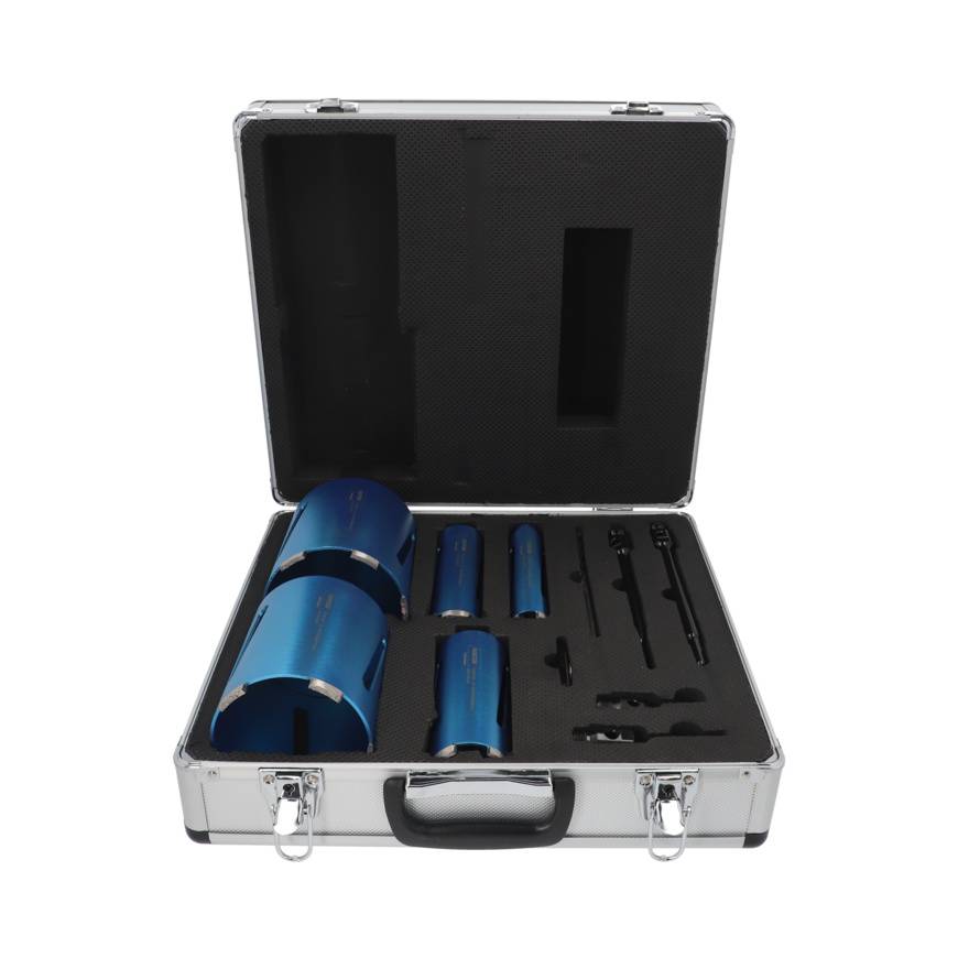 Komplektis on: Puurkroonid 38 mm, 52 mm, 65 mm, 117 mm, 127 mm, kaks kuuskant- ja kaks SDS-adapterit, üks väljatõukaja, üks juhtpuur.