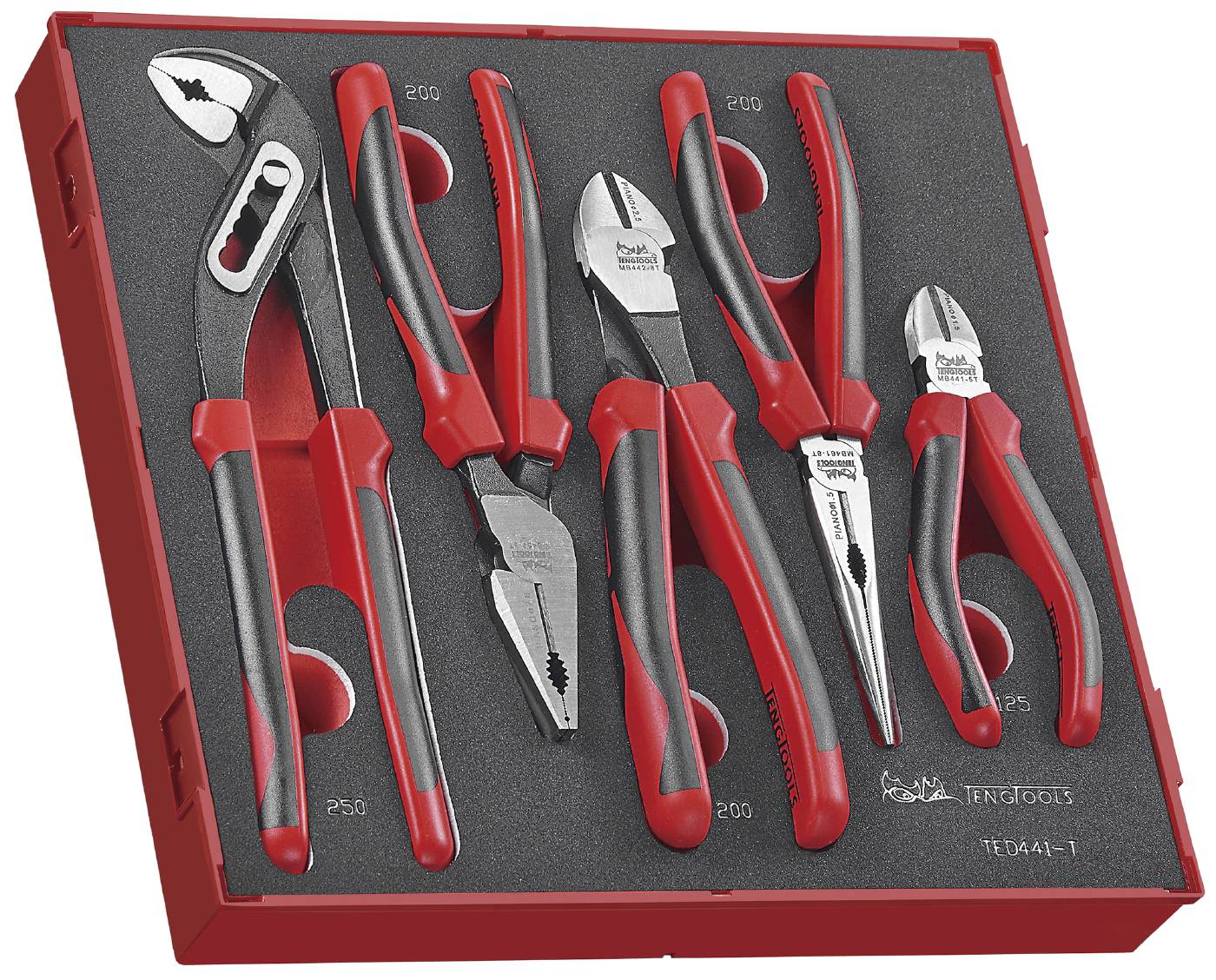 5osaline komplekt kroommolübdeenterasest tangidega, millel on ergonoomilised kahekomponentsed käepidemed. Komplektis on veepumbatangid, näpitsad, lamemokktangid ja kahed külglõiketangid, 125 mm ja 200 mm. Tarnitakse eemaldatava kaanega moodulkastis. Tööriistad asuvad kolmest erivärvilisest kihist koosnevasse EVA-plasti freesitud pesades. Kastid sobivad Teng Tools tööriistakastidesse ja tööriistakärudesse.