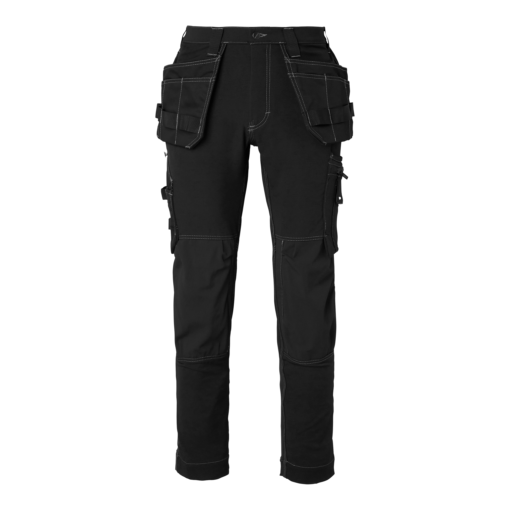 Four-way stretch-fabric craftmens trousers in a modern cut. The trousers have articulated knees and CORDURA® knee pockets. The knee protection can be positioned at two different levels. Two front pockets. Two reinforced bellows-style back pockets. Loose-hanging nail pockets reinforced with CORDURA®. The hanging pockets have three accessory compartments and tool loops. ID-card pocket. Adjustable hammer holder. Front folding rule pocket that is loose at the bottom for improved comfort. The folding rule pocket has two knife-holders, a knife loop and a pen pocket. Leg pocket with a zip, a large accessory compartment and a phone compartment. Reflective trim on the back for enhanced visibility.
