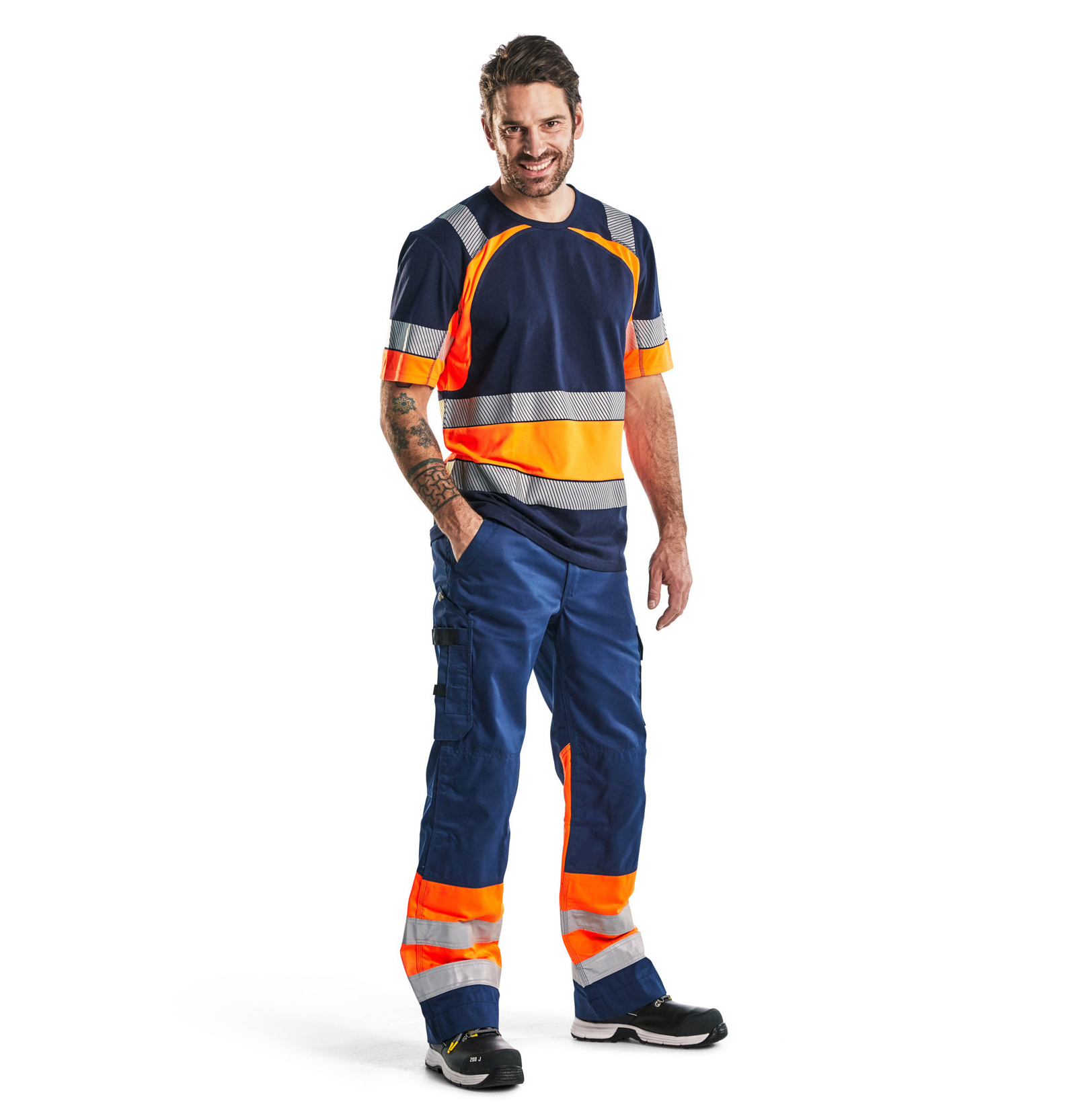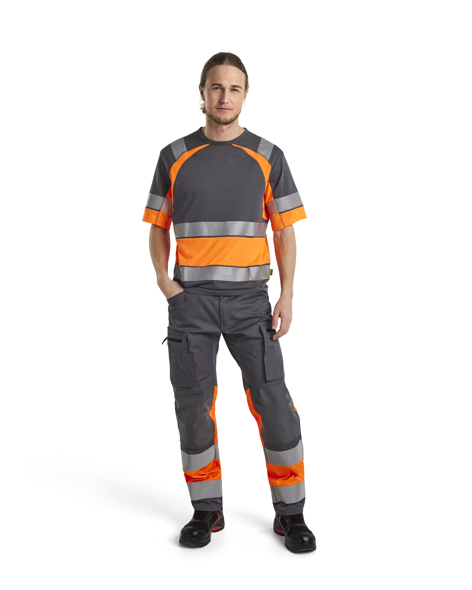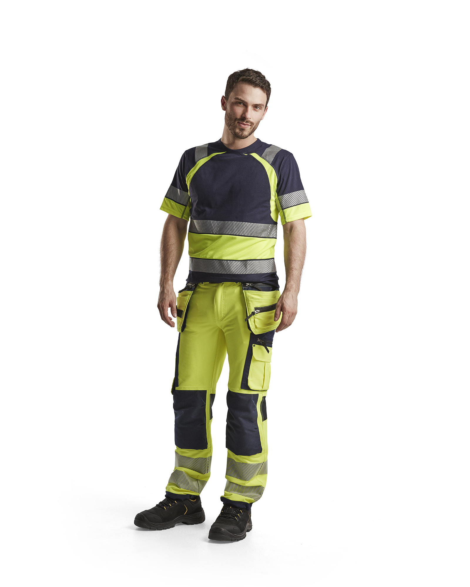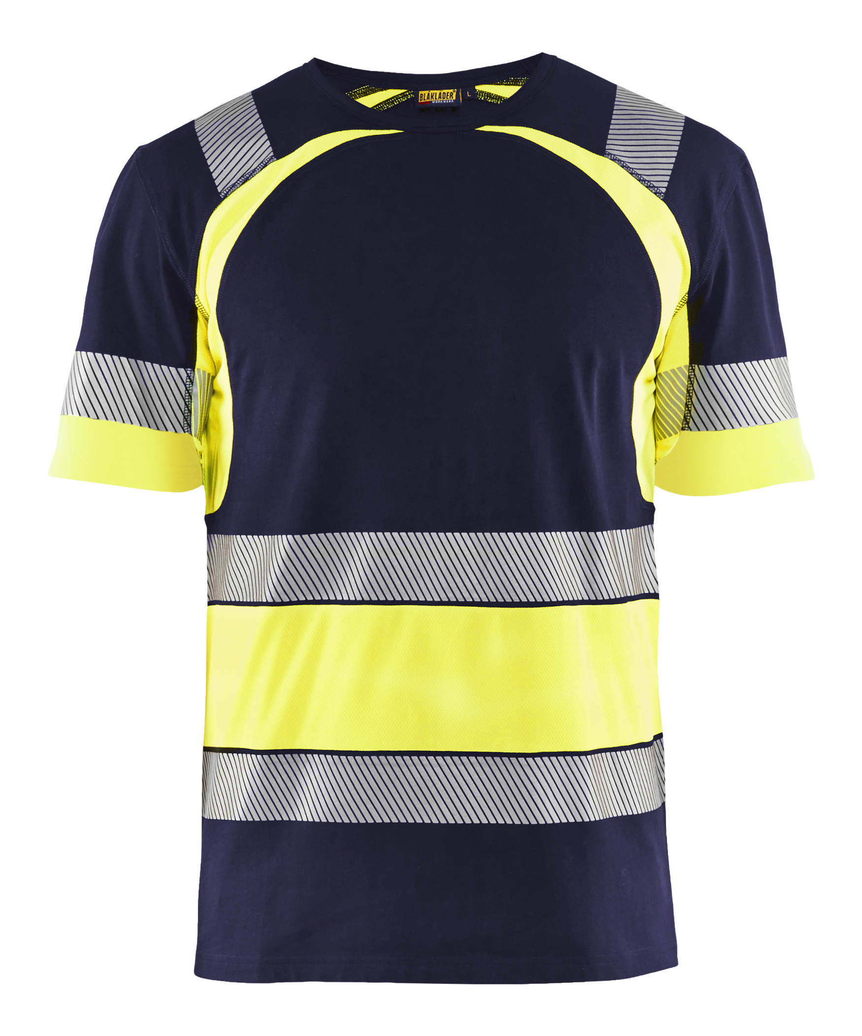 Kaasaegne, pehme ja mugav puuvillane T-särk. Hea niiskust eemaldav Hi-Vis-kangas. Ümar kaelus, tugevdatud kaelaõmblusega. Segmenteeritud helkurriba toetab ventilatsiooni ja tagab tänu venivusele parema liikuvuse. Kampsuni tume osa koosneb 100% puuvillast ja kõrge nähtavusega osa 100% polüestrist. Sertifitseeritud vastavalt standardile EN ISO 20471, 1. klass.