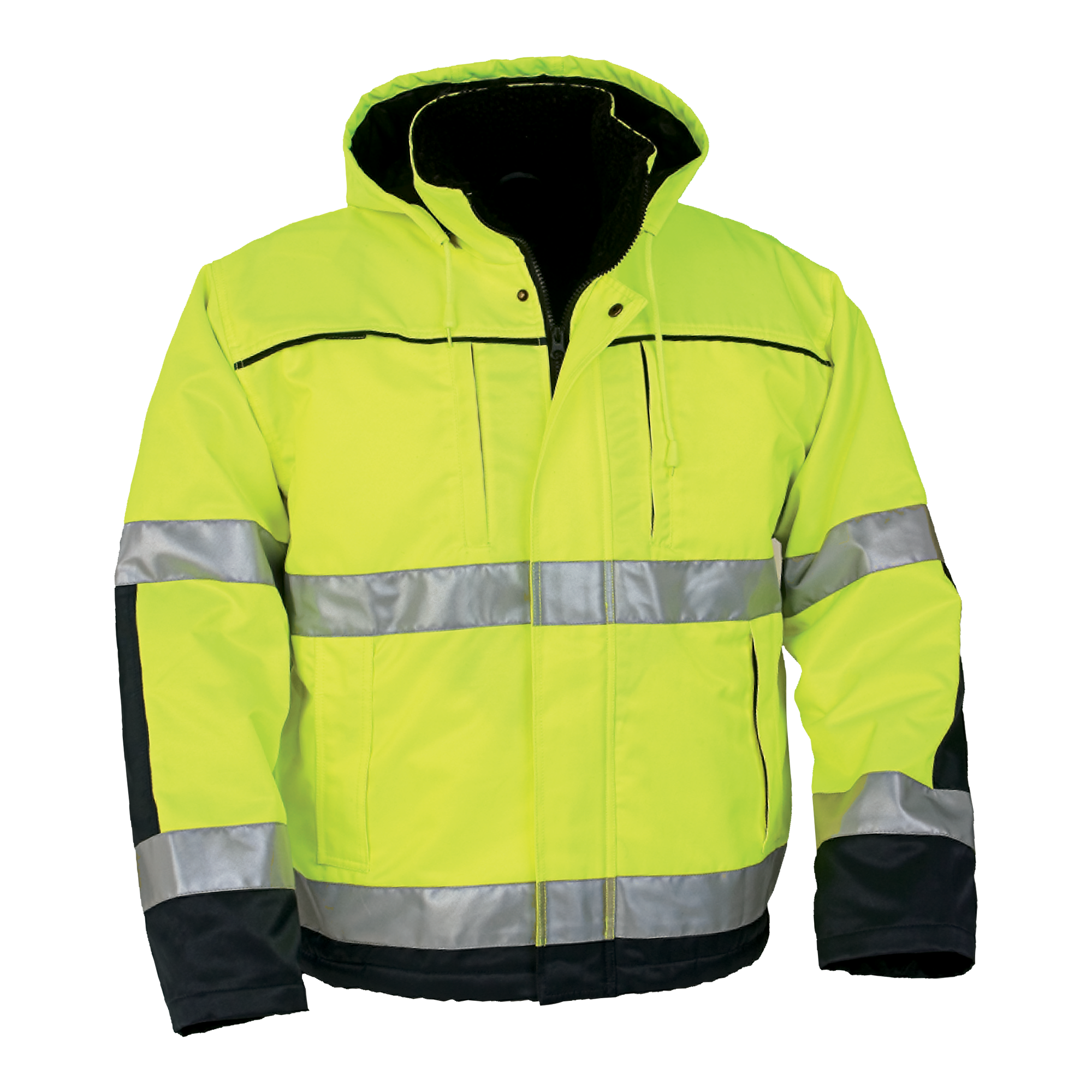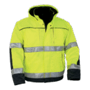 High-vis winter jacket with quilt-lined sleeves and double-lined pile with a fleece-laminated torso. Adjustable, detachable lined hood. Two chest pockets and two front pockets with enclosed zips. Phone compartment in one of the chest pockets. Detachable ID-card pocket. Two inner pockets, one with a phone compartment. Drawcord at the hem. Ribbed cuffs. Extended back. CORDURA®-reinforced in exposed areas. EN ISO 20471 Class 3.