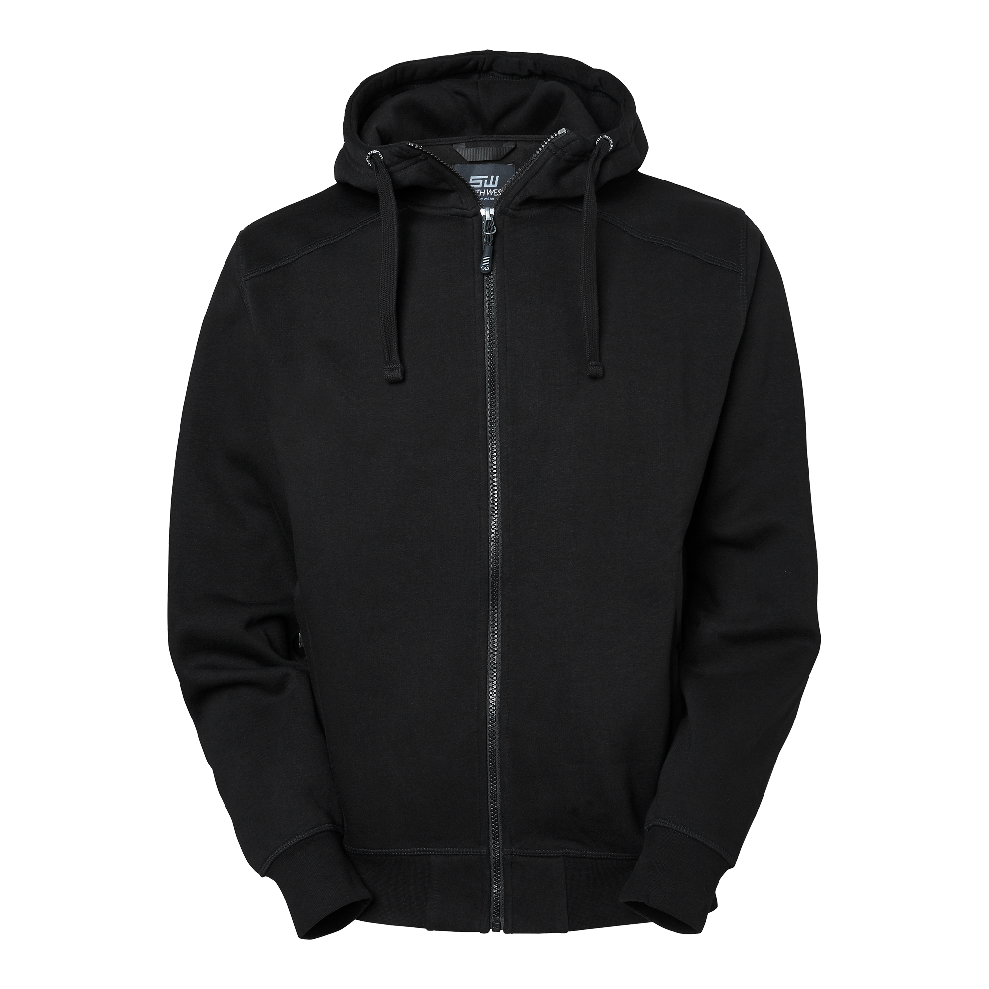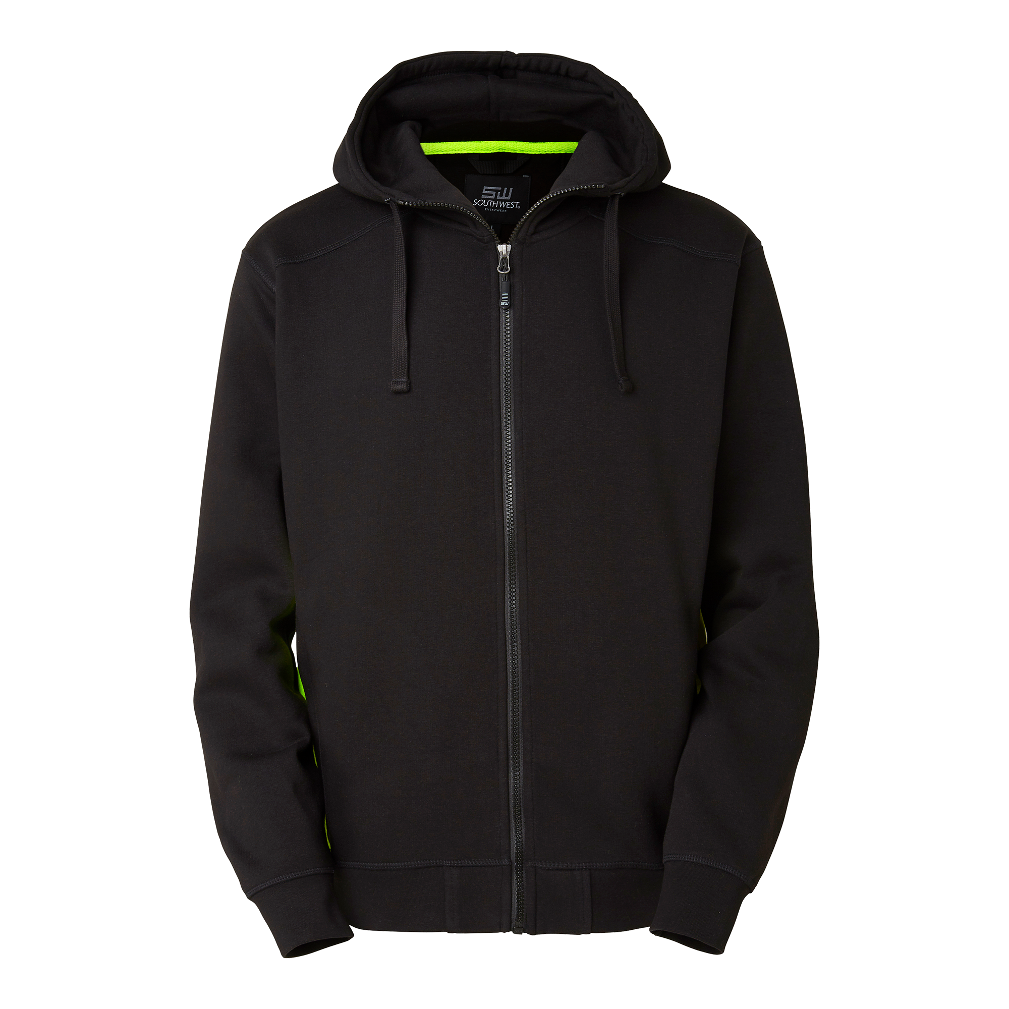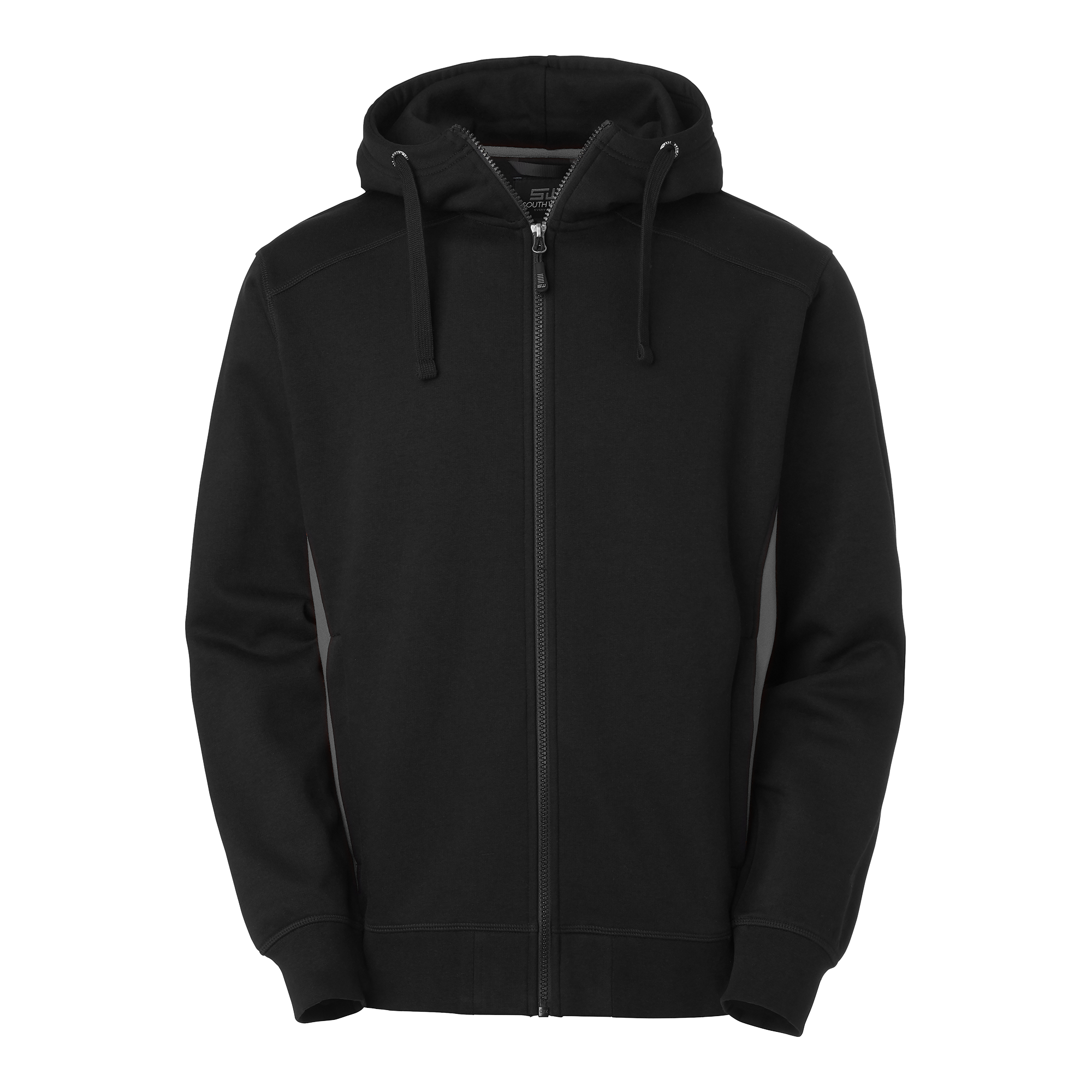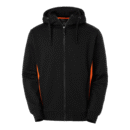 Sweat jacket with brushed inside and contrast panels at the sides. Two spacious front pockets with zips. High neck hood with drawstring to easily adjust fit. Bottom hem and cuffs in stretch fabric. Alternative colour available for enhanced visibility.