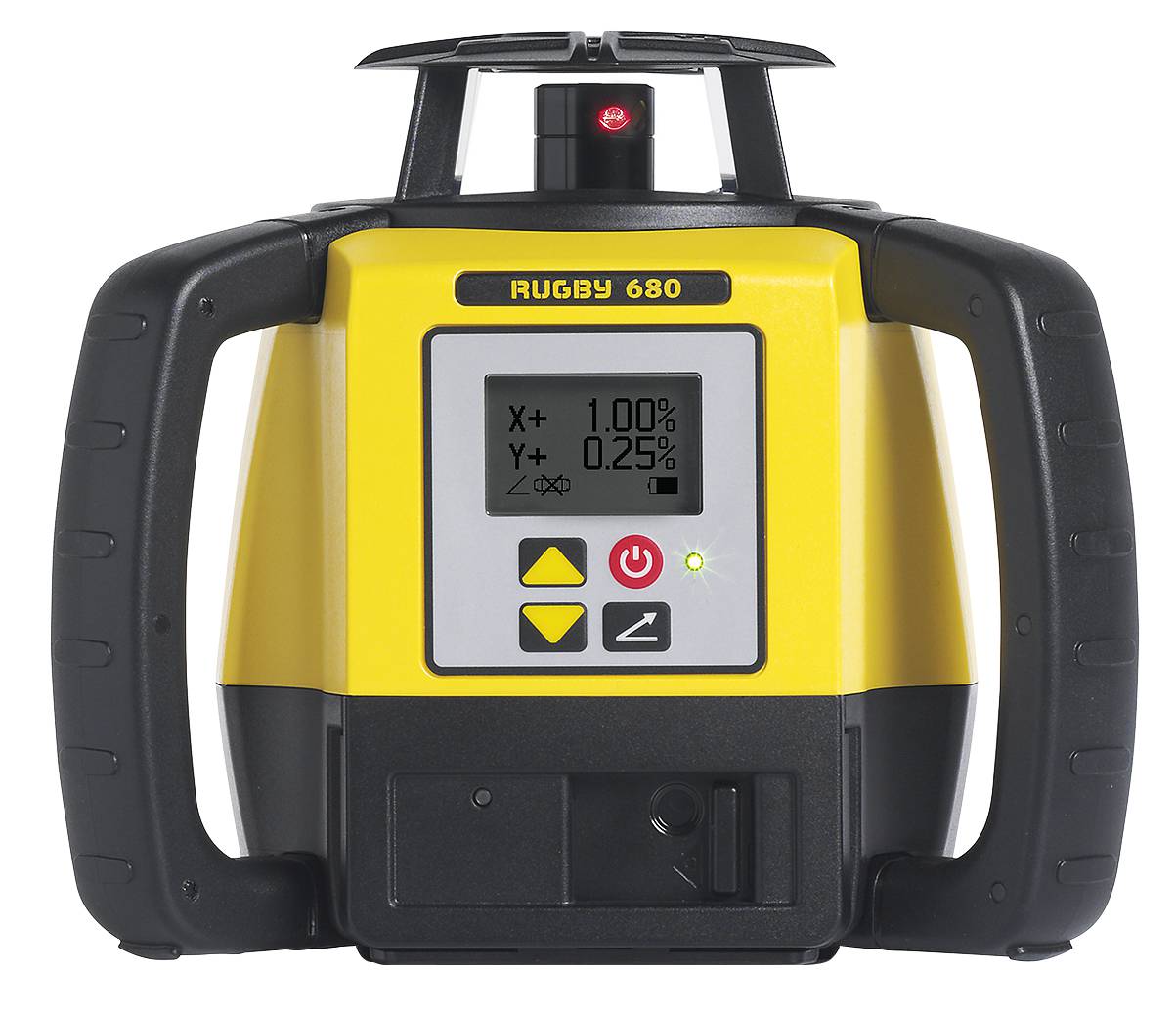 Rugby 680. Poolautomaatne kõrge täpsusega digitaalne topeltkaldlaser. Sama funktsionaalsus ja teostus nagu Rugby 670 (art nr 232070409), kuid kallet saab käsitsi seada nii X- kui Y-telje suhtes.